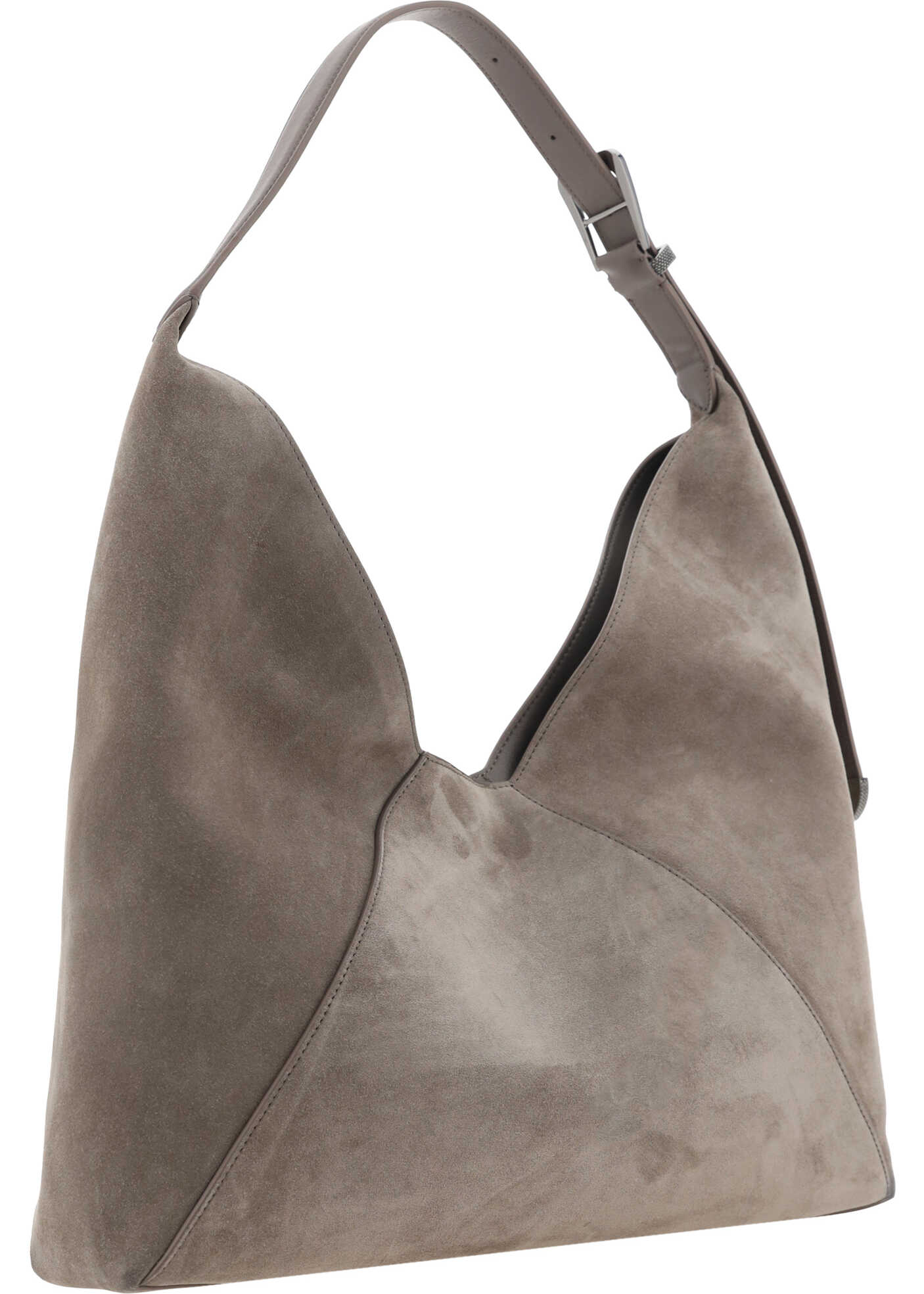 Leather Shoulder Bag by Brunello Cucinelli featuring an adjustable flat shoulder strap at the top, a suede paneled design, a top magnetic button closure, a single compartment, and the brand's iconic monogram embossed at the front.
