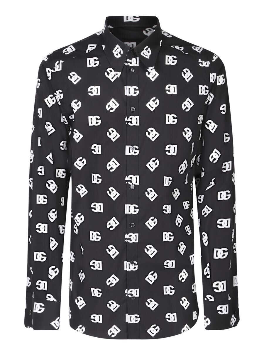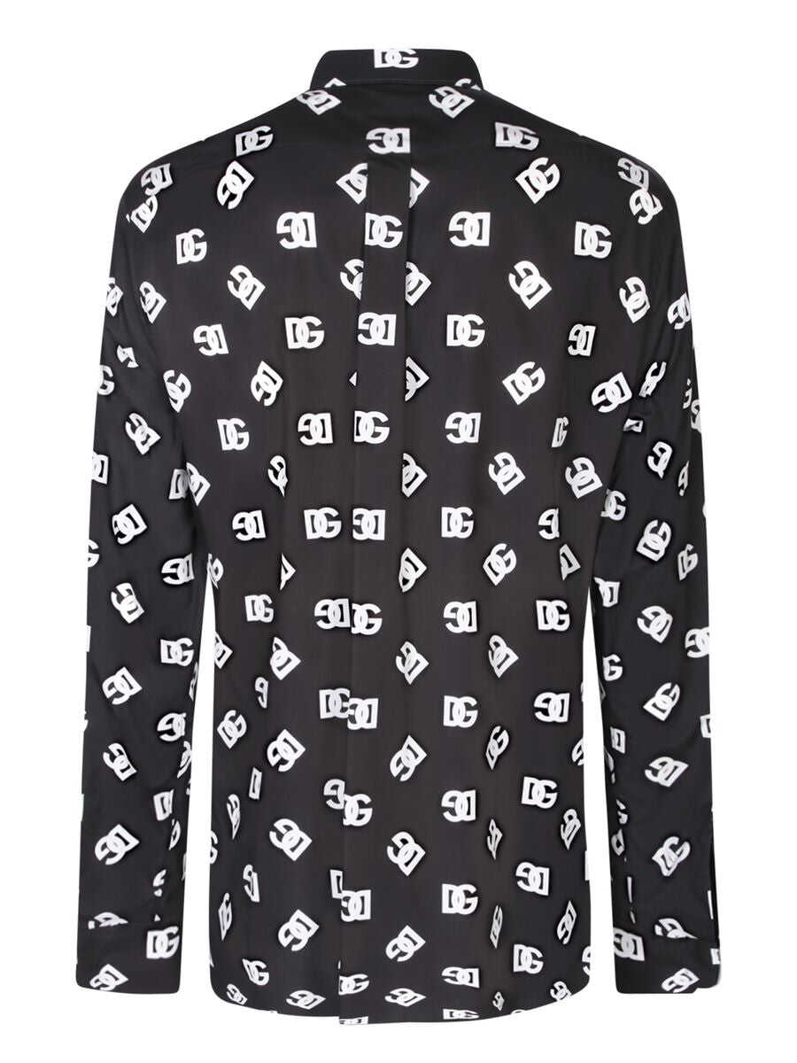 black/white cotton all-over logo print straight-point collar front button placket long sleeves buttoned cuffs curved hem