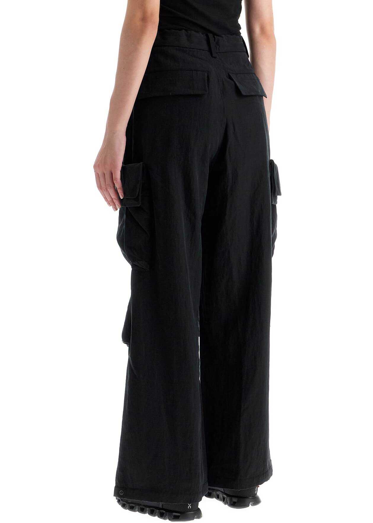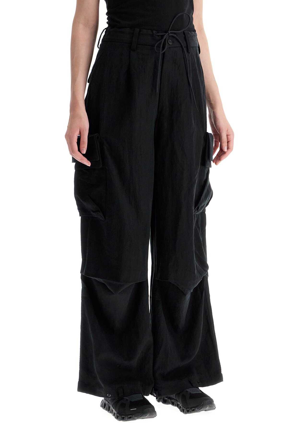 Y-3 cargo pants with a fluid and wide high-waisted fit, featuring waist darts and knee pleats. Made of lyocell, they are distinguished by the adjustable hem in three positions and double pockets on the legs. The design is completed by belt loops and drawstring at the waist, front zip and button closure, slanted side pockets and flap back pockets. The model is 177 cm tall and wears size XS.