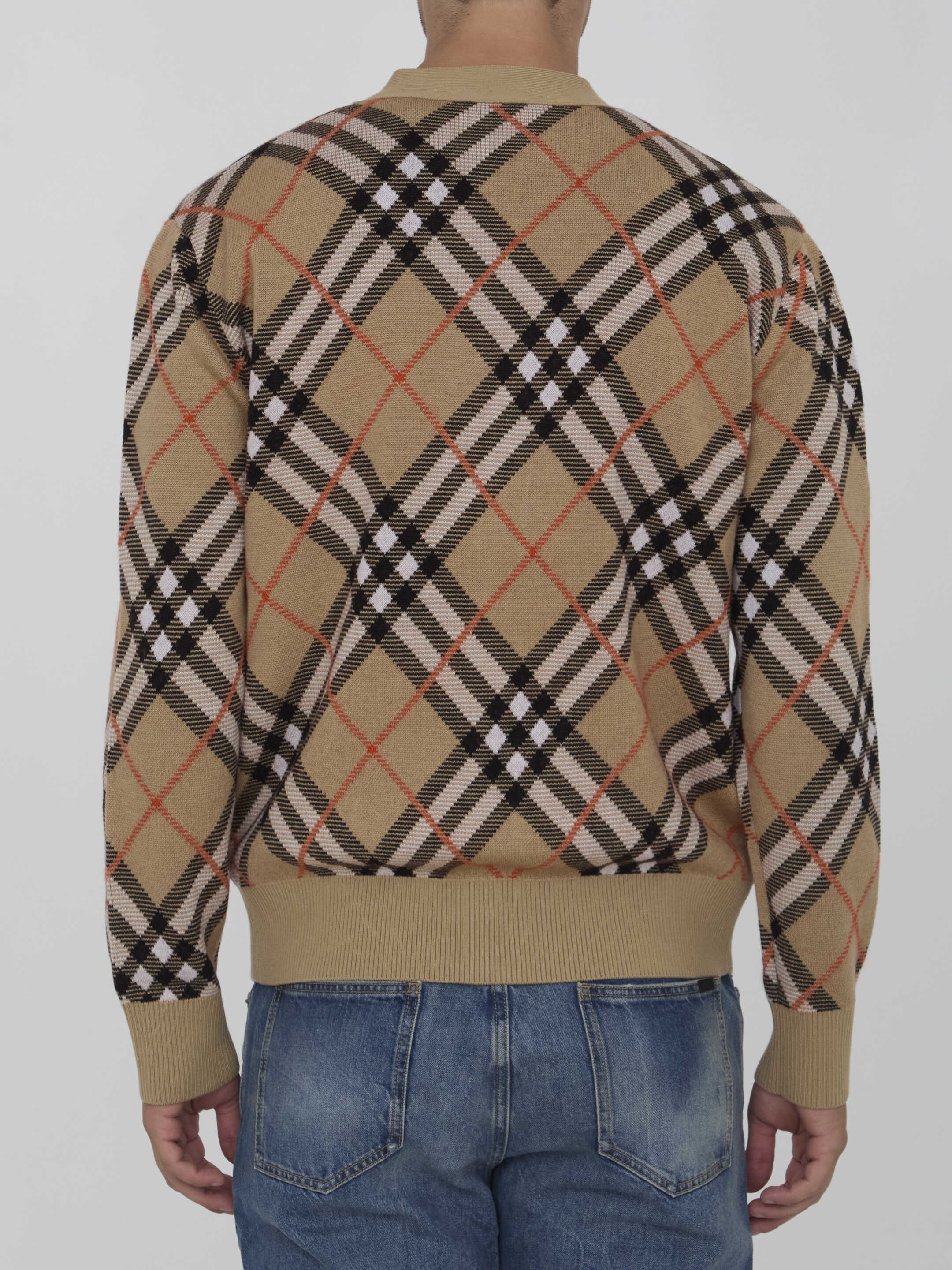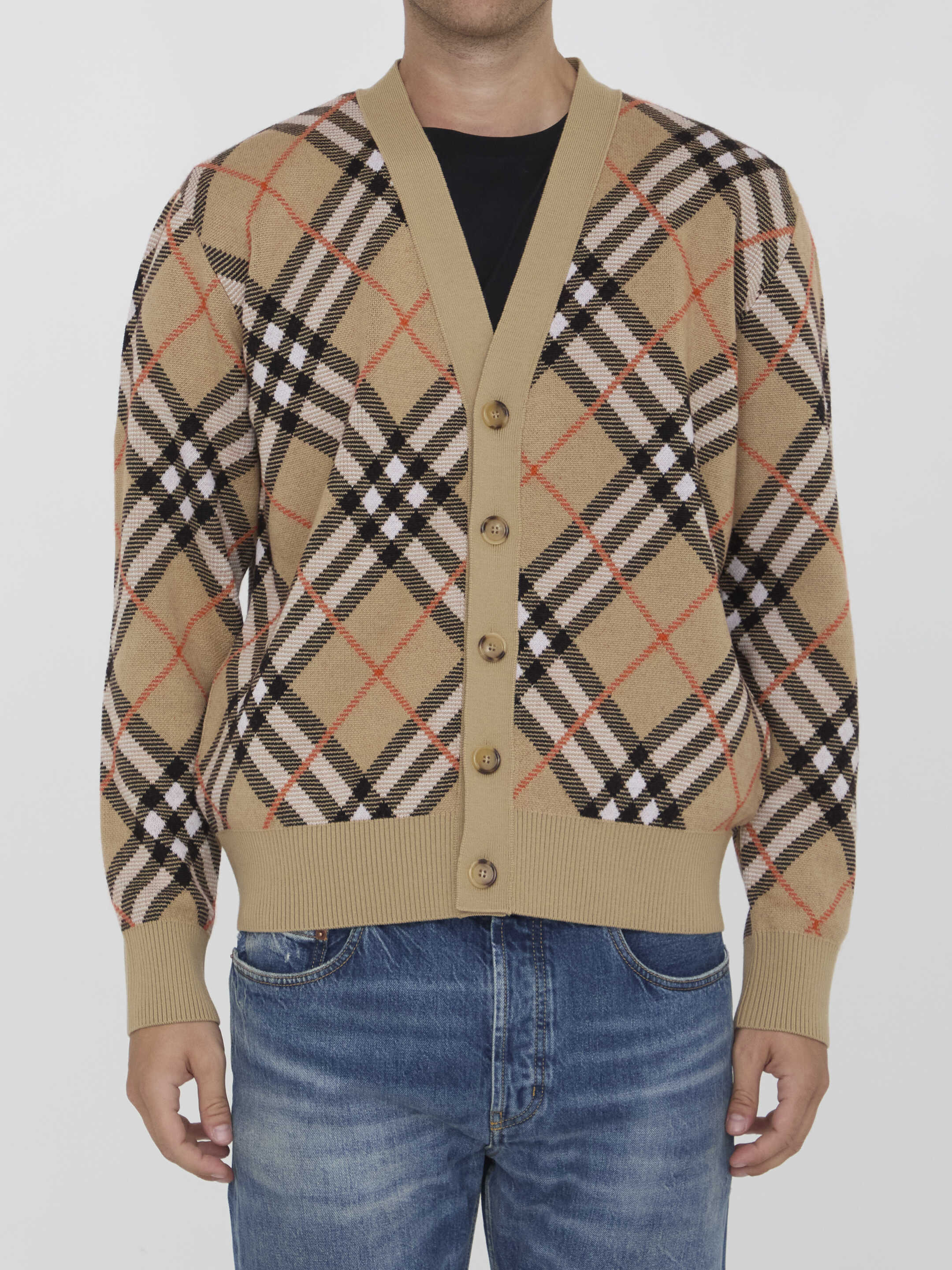 Cardigan in wool and mohair blend with Burberry Check motif. It features V-neckline, front button closure and ribbed trims. Relaxed fit.