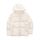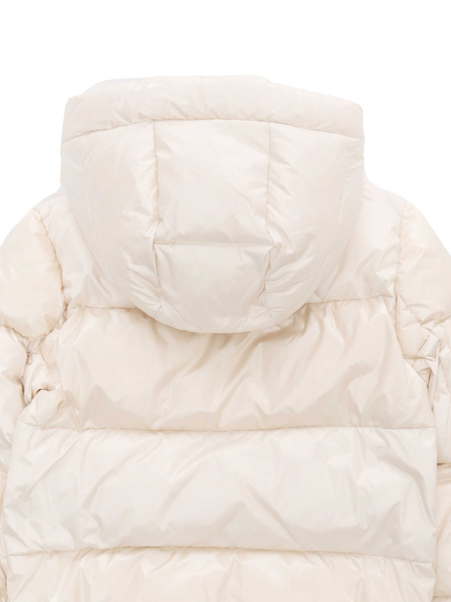 Cream colored down jacket with glossy finish, fixed hood with tone-on-tone lettering, zip fastening, side pockets, down padding, logo detail