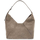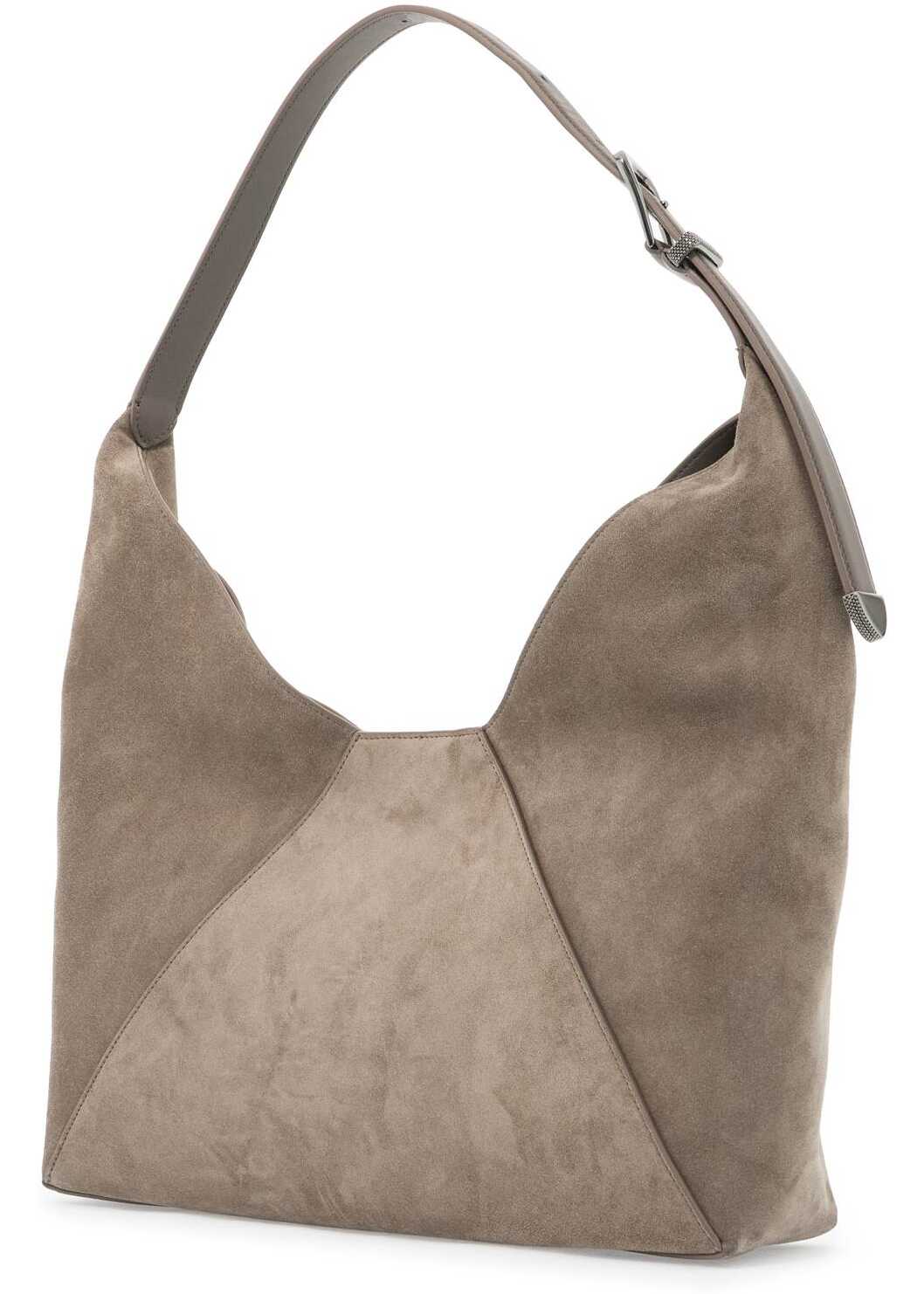 The BC Duo hobo bag is made of suede leather and features a panel construction with soft, retro lines enhanced by a velvety texture. It has a magnetic button closure and a leather-lined interior with two open compartments. The adjustable handle is made of smooth leather and adorned with the classic monile on the tip and loop.