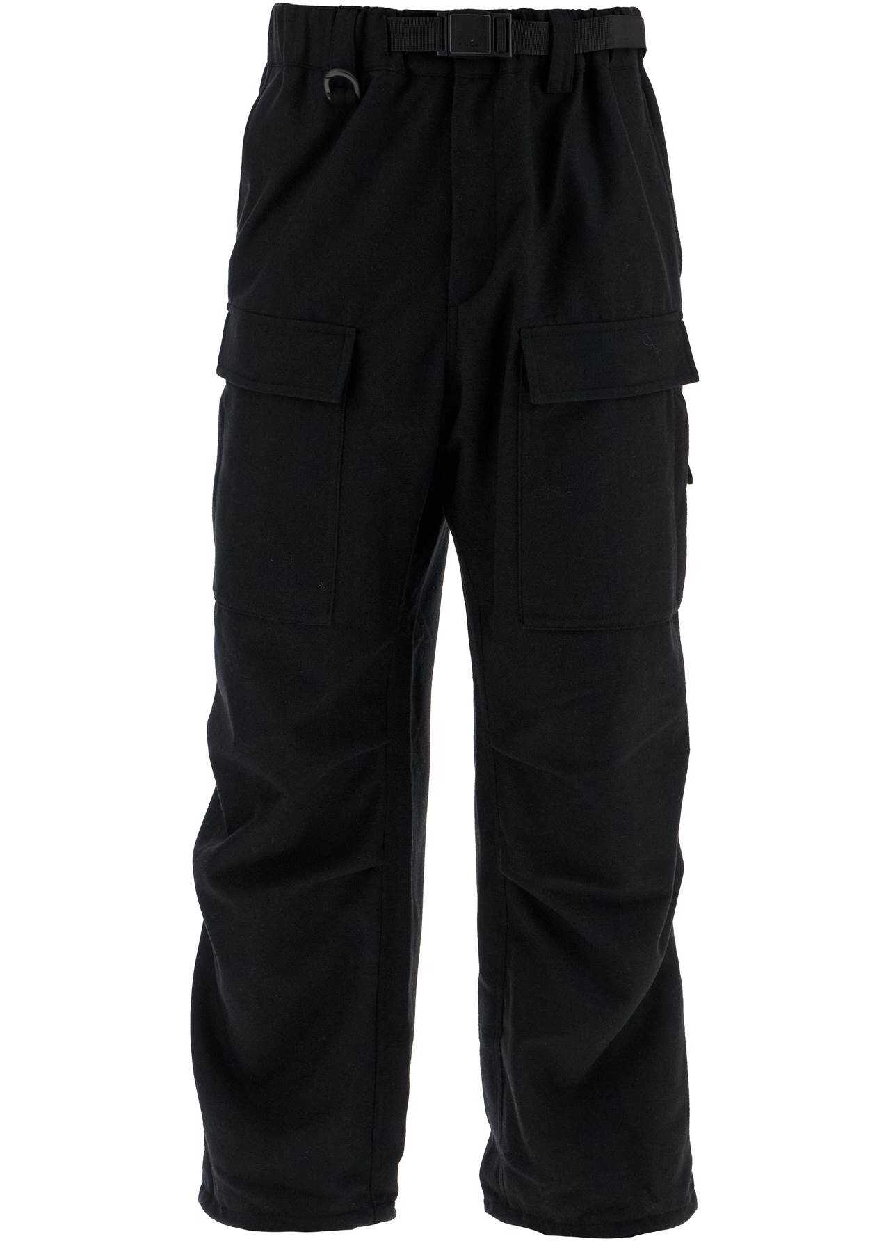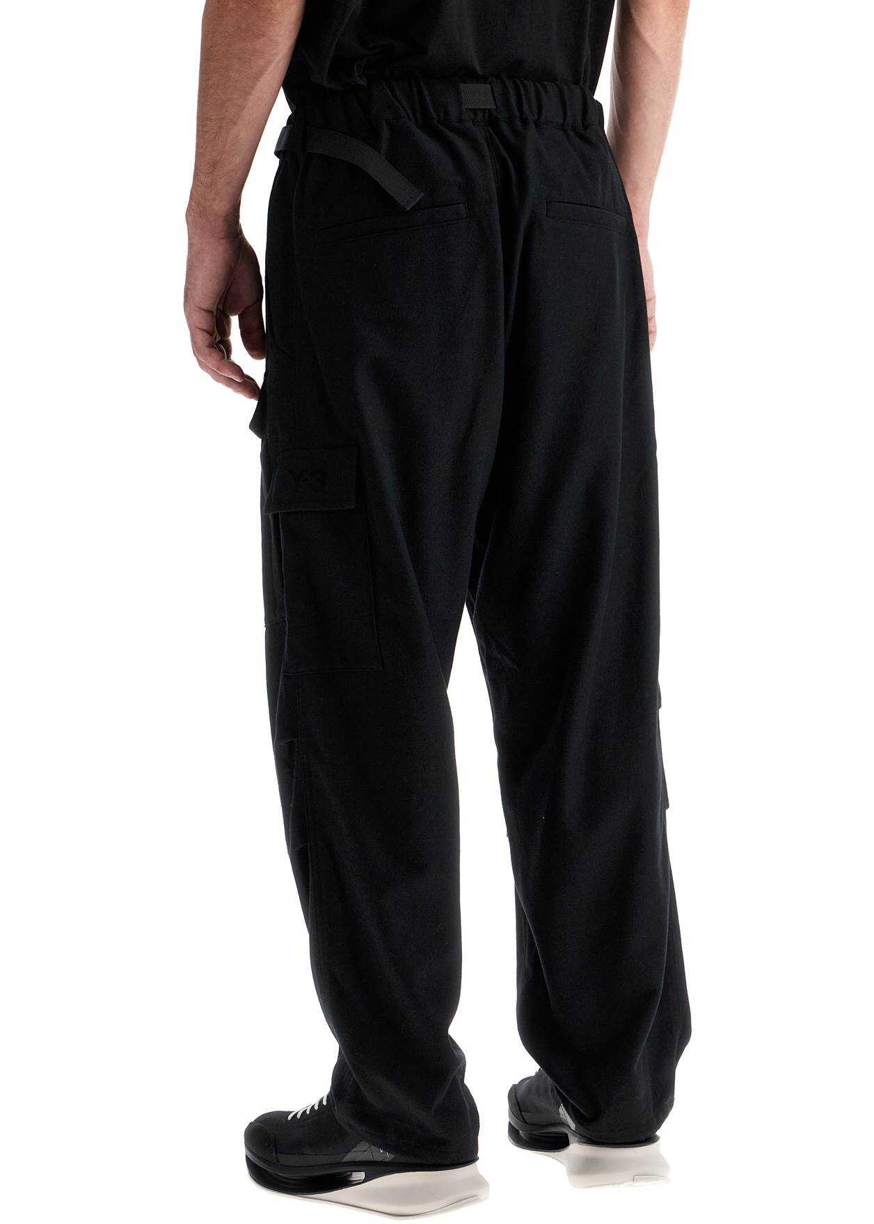 The Y-3 cargo pants feature a relaxed fit with knee pleats and a multi-pocket design. Made from a wool blend flannel, they have an elasticated waistband with integrated belt, front zip and hidden button closure, and adjustable leg cuffs with elastic drawstring. The model is 187 cm tall and wears size M.