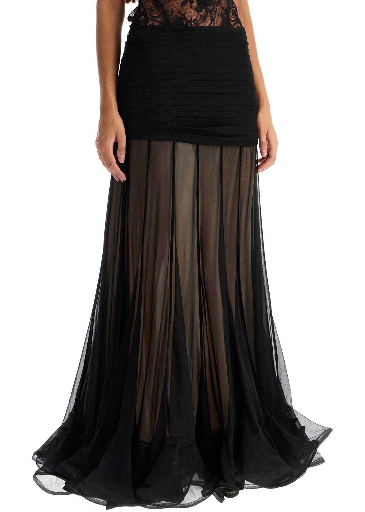 The Maxi Flouce skirt by Zimmermann is made of silk chiffon with a pleated waistband and a transparent finish with a crinoline hem. It features an invisible back zip closure and a viscose georgette underskirt. The model is 177 cm tall and wears size 1 Zimmermann.