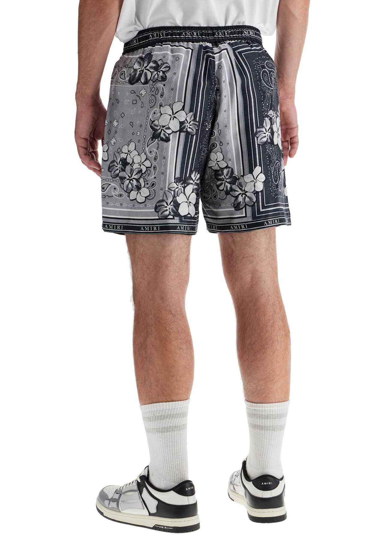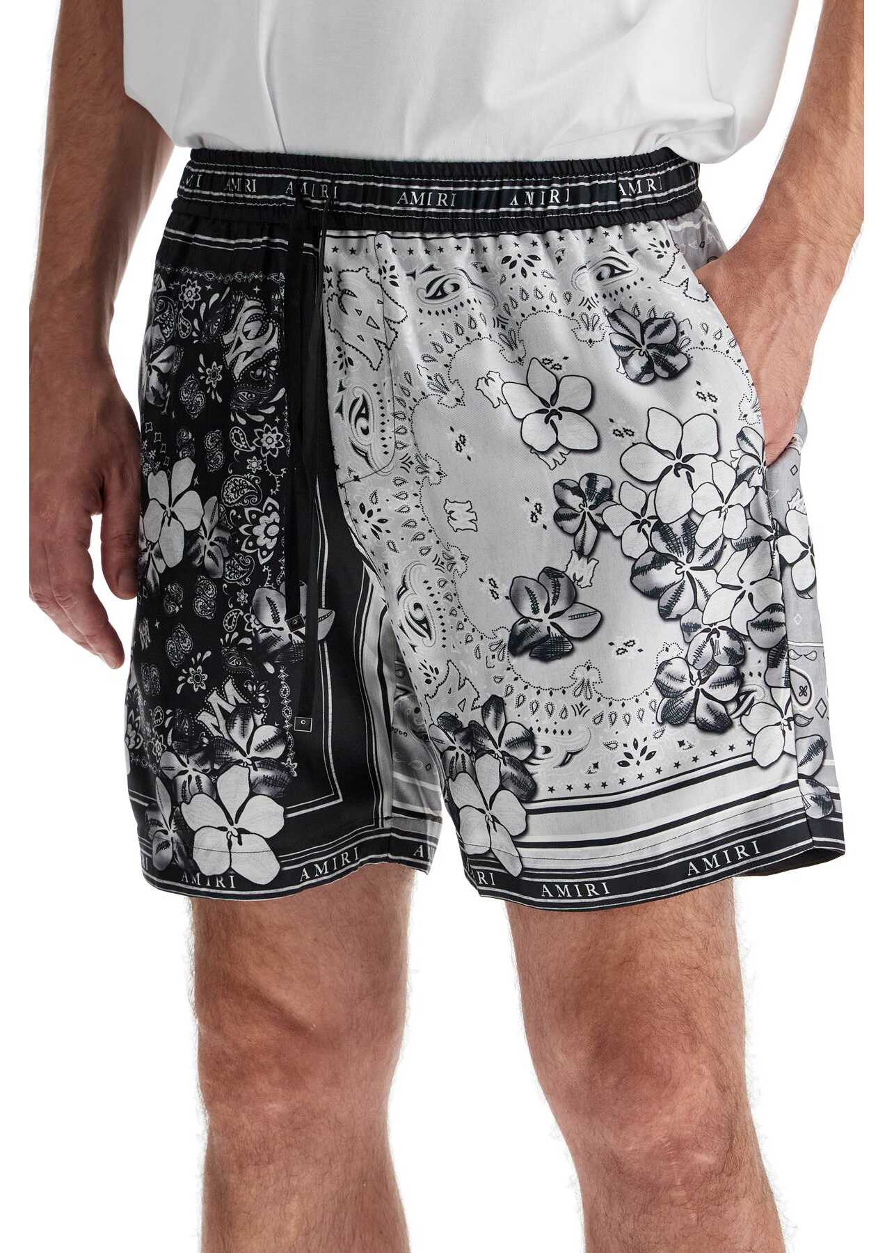 Amiri drawstring Bermuda shorts made of pure silk twill with all-over floral bandana print and logo borders. Featuring side seam pockets, they are finished with an elasticated waistband. The model is 187 cm tall and wears size M.