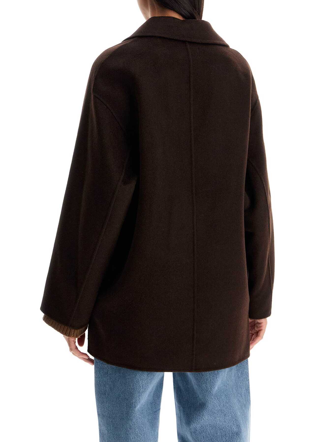 This Loulou Studio caban is made of soft wool and cashmere fabric with an unlined, deconstructed double-breasted design. It features a notched lapel, flap pockets, and is finished with side slits at the back. The fit is relaxed with raglan sleeves. The model is 177 cm tall and wears a size XS.
