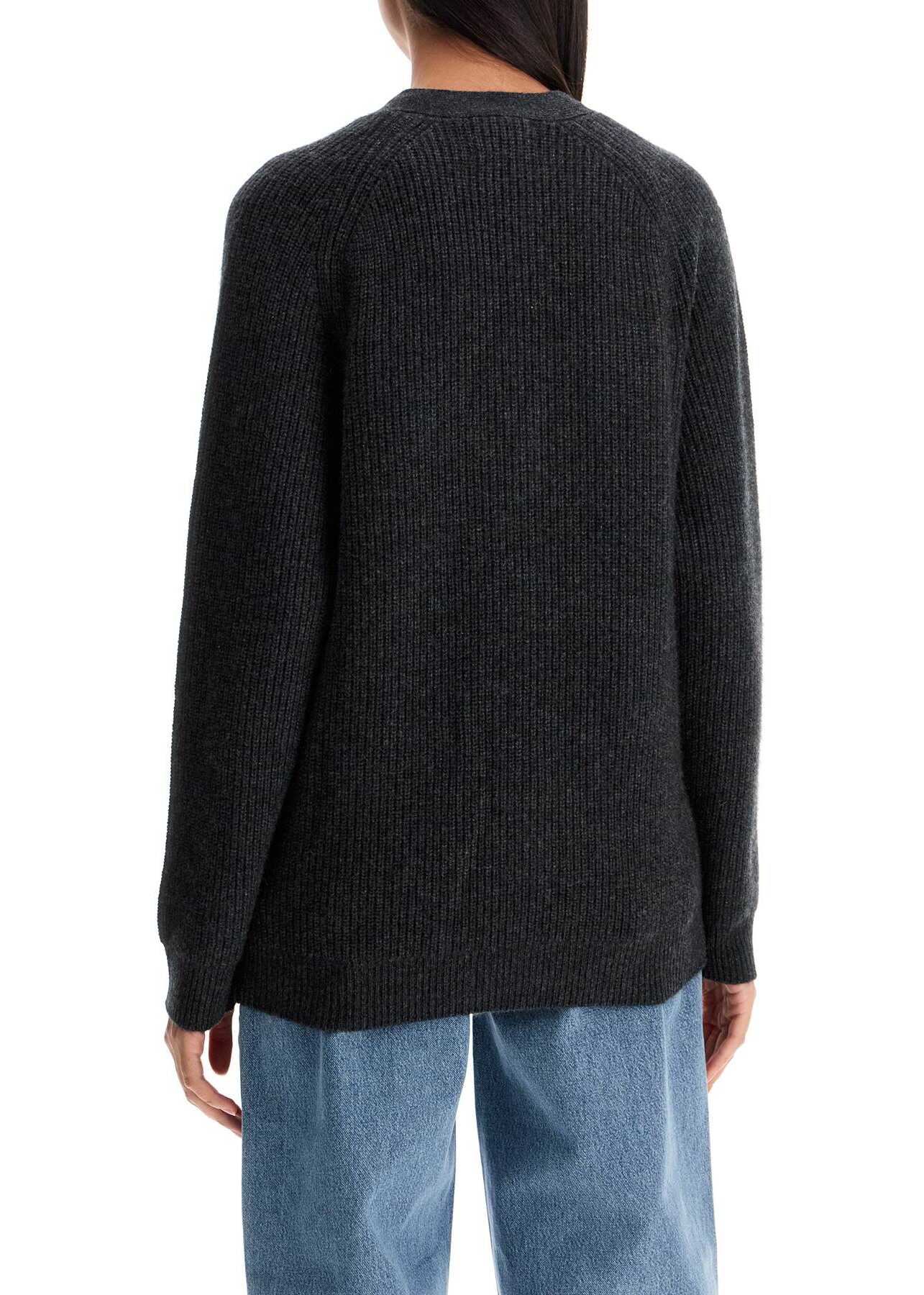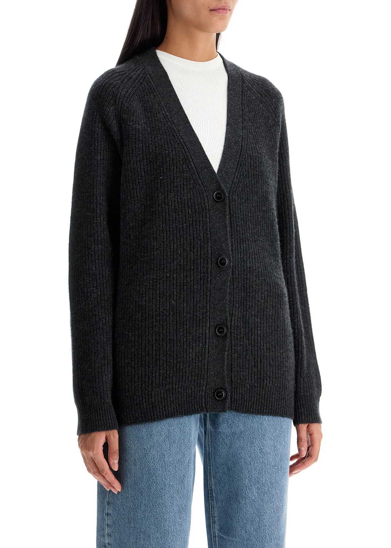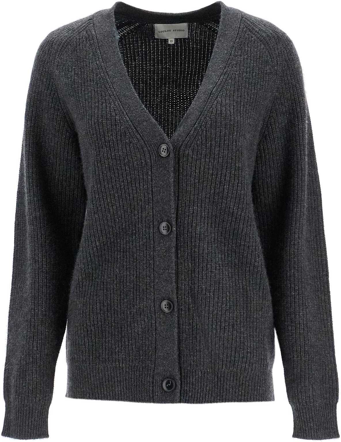 This Loulou Studio cardigan is made from pure cashmere yarn with a mélange effect, crafted in an English rib stitch. It has a straight and soft cut, featuring a V-neckline, front button closure, and finished with raglan sleeves. The model is 177 cm tall and wears a size XS.