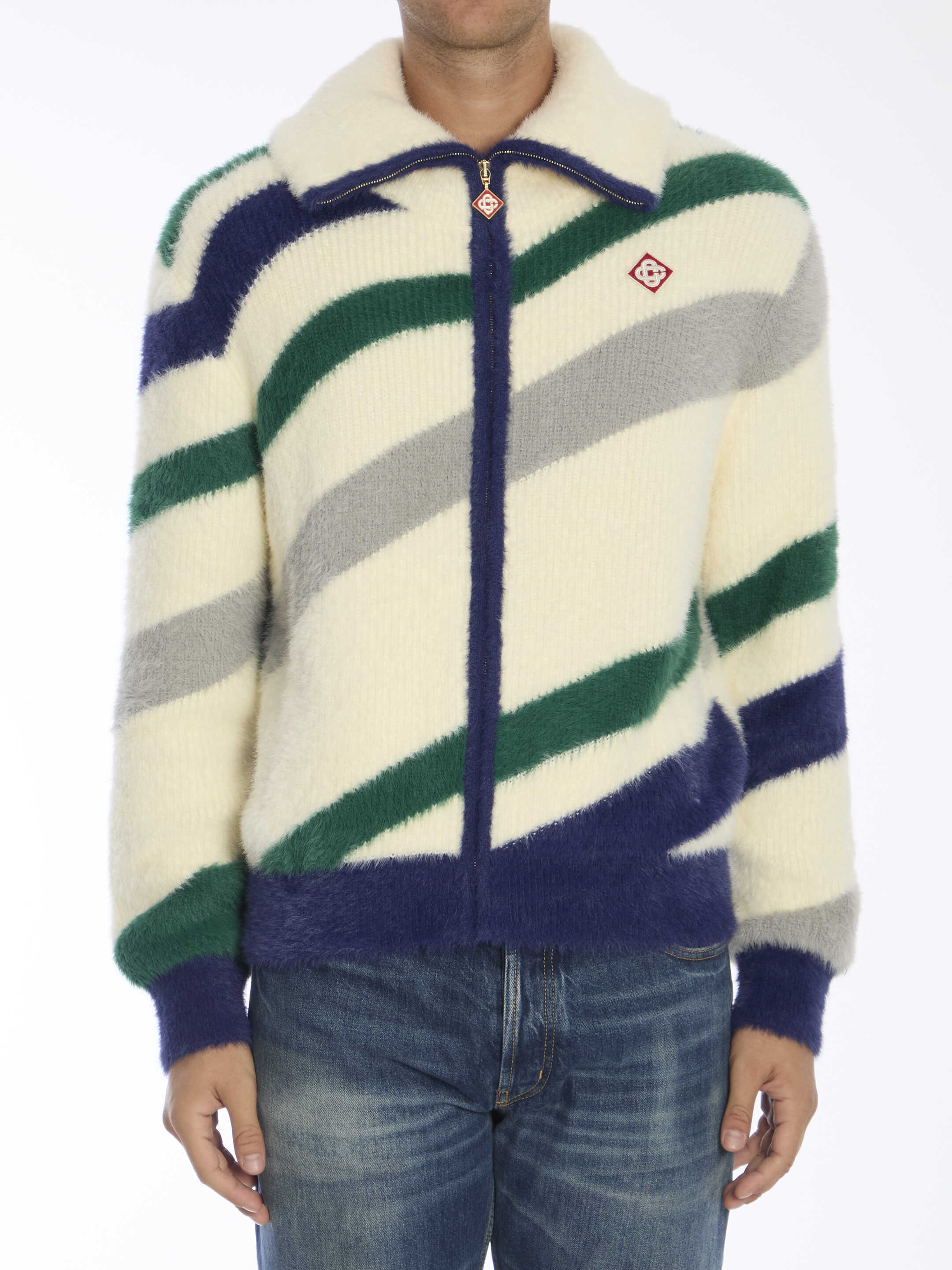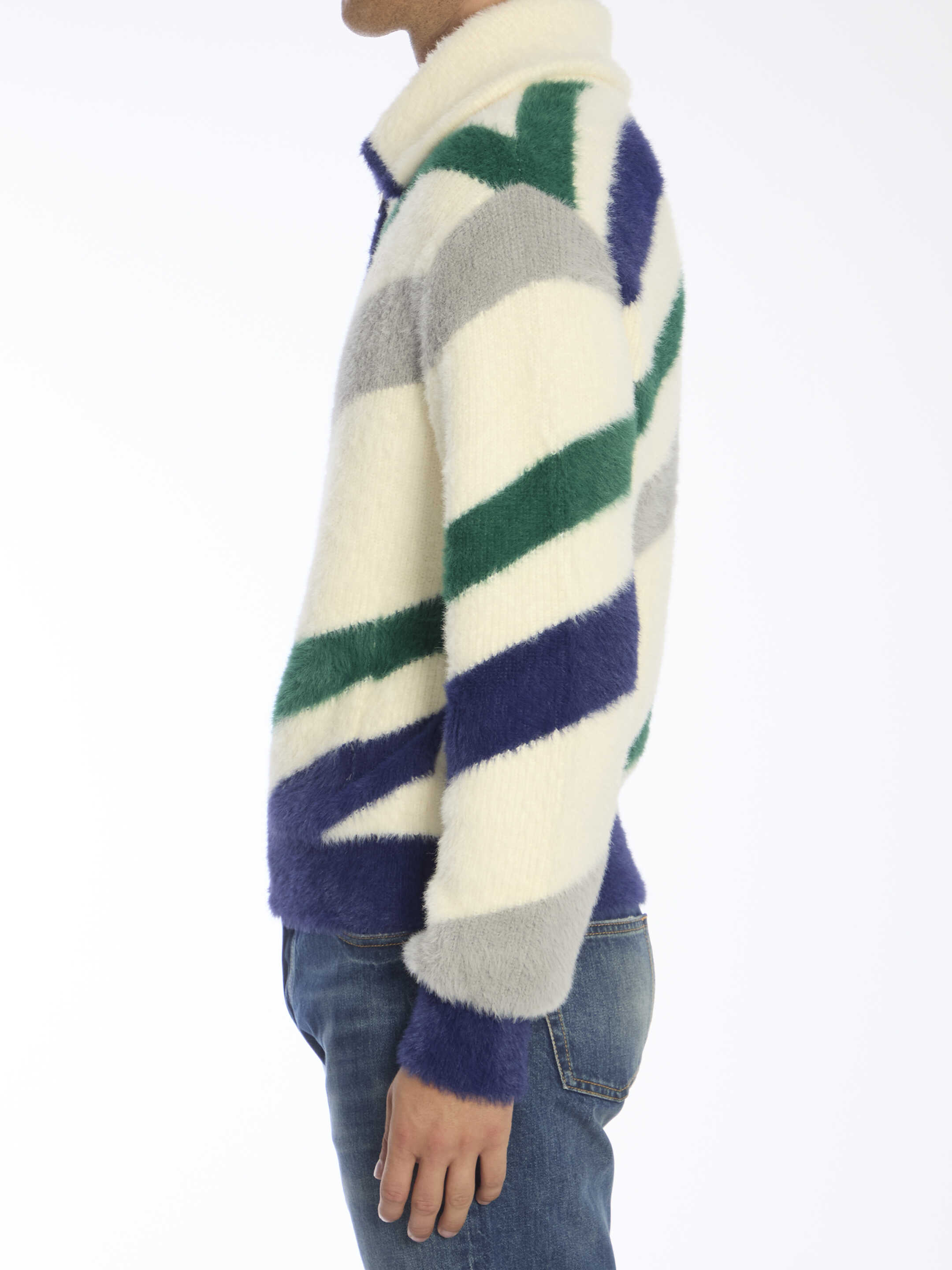 Fluffy zip-up jumper in multicolor nylon and cotton blend with diagonal stripes. It features funnel neck, front zip closure, logo patch on chest and ribbed trims. Regular fit.