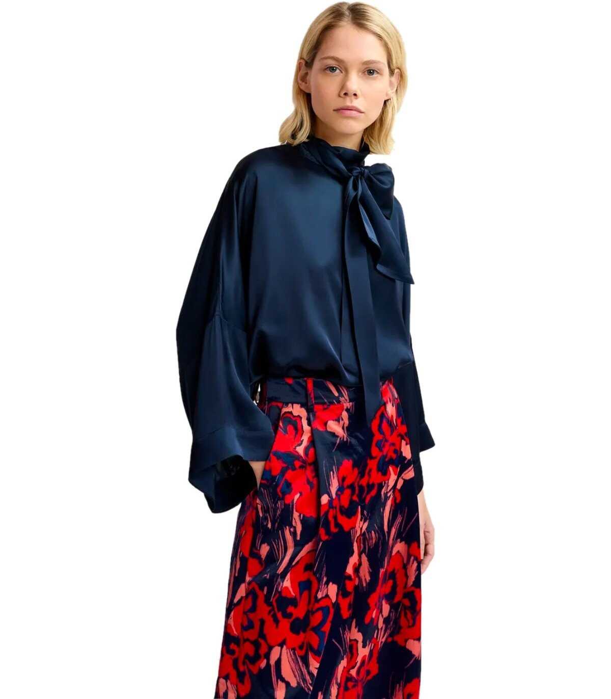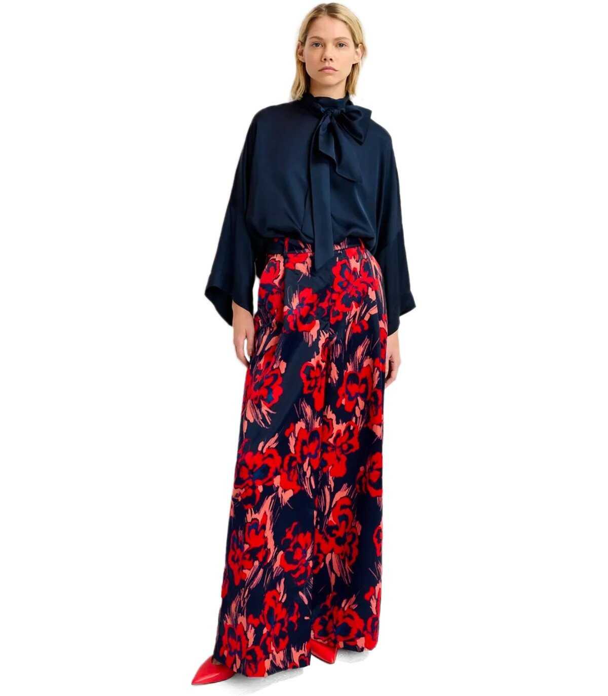 Gazpacho trousers by Essentiel Antwerp made of blue satin-effect recycled polyamide fabric, with a pattern in shades of red. High waist, side pockets, zip and button closure. Wide leg, relaxed fit.