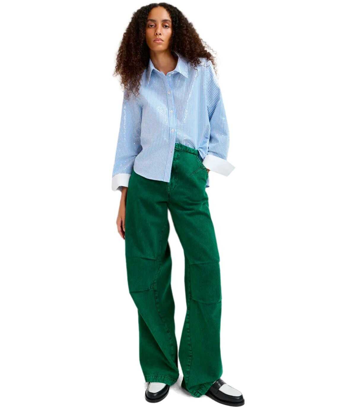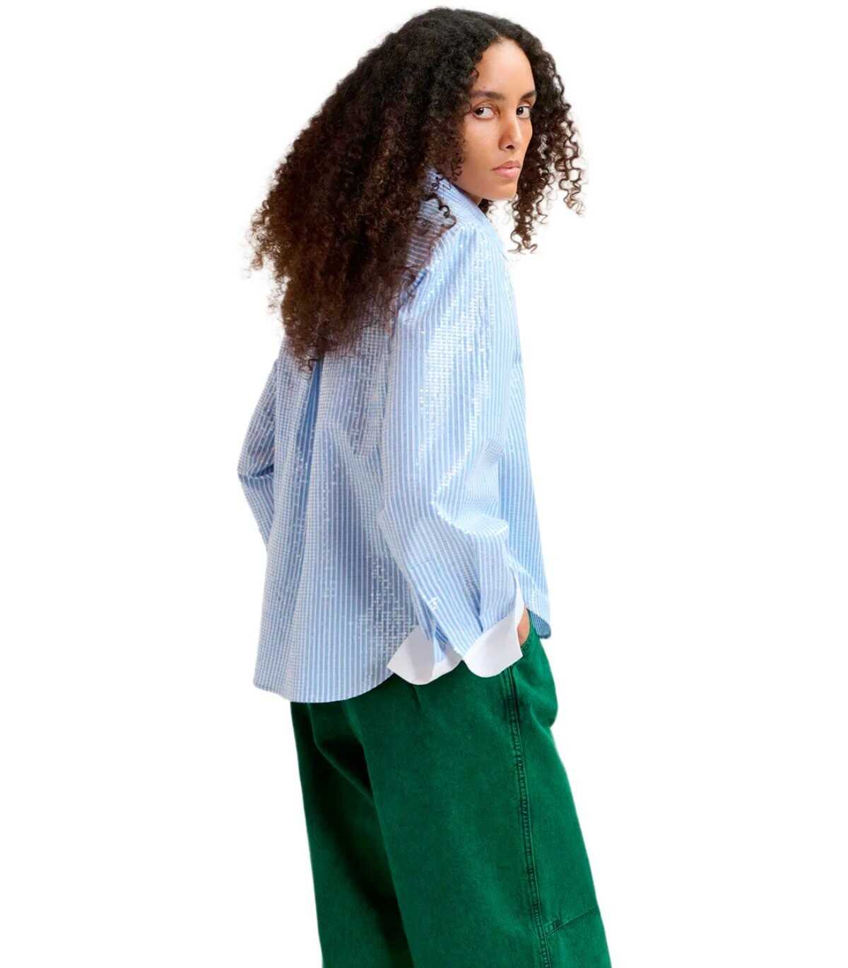 Shirt by Essentiel Antwerp made of blue cotton poplin with a vertical striped pattern, enhanced by the application of sequins for a sparkling effect. Contrast cuffs, button closure, relaxed fit.