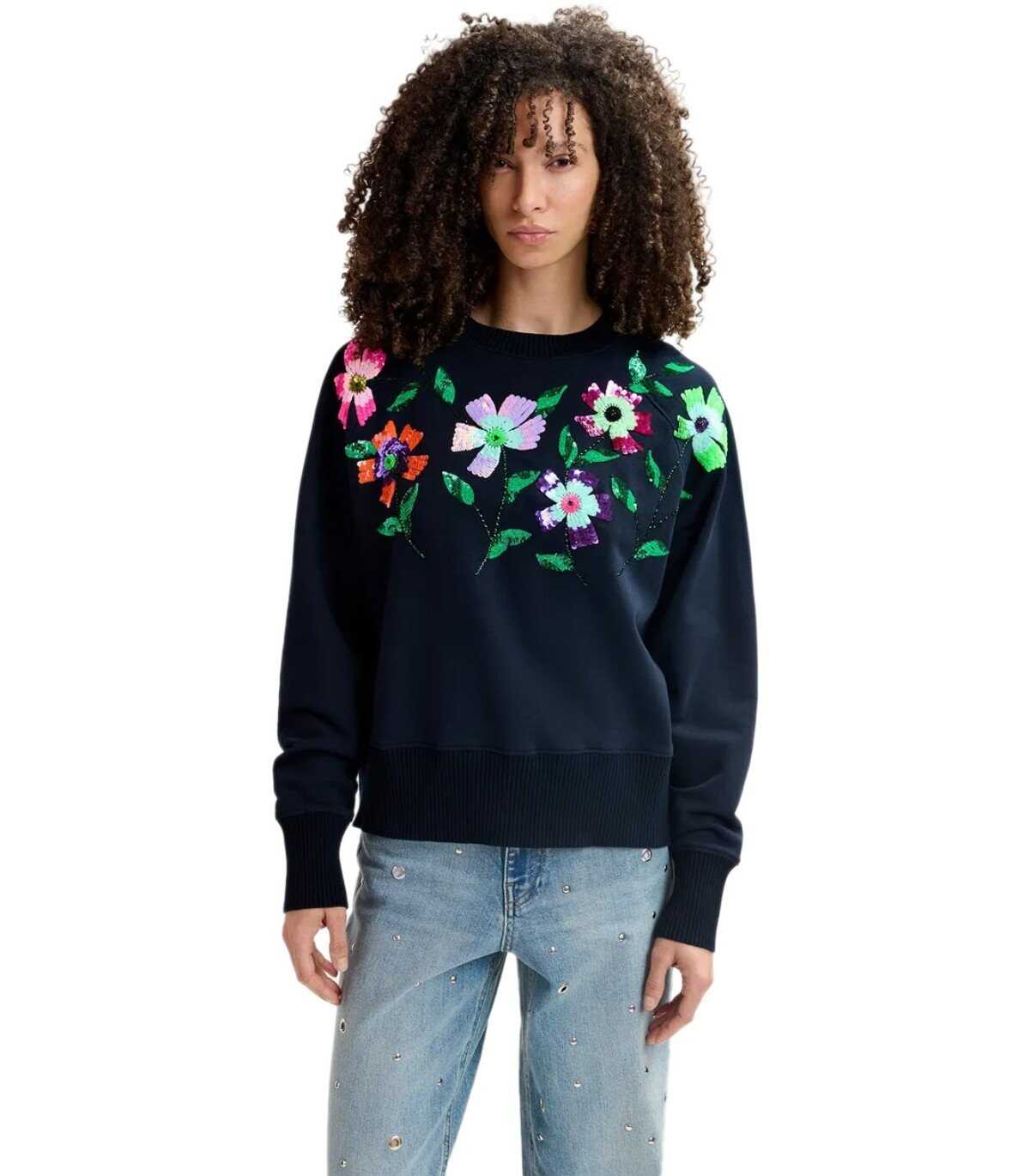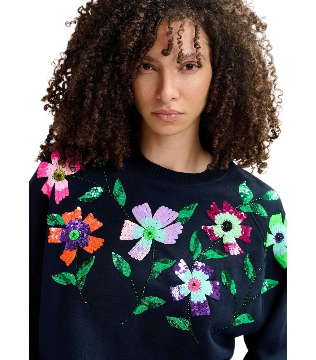 Graaf sweatshirt made of navy blue organic cotton, decorated with flower appliqués made of colored sequins. Ribbed collar, cuffs, and hem. Oversize fit.