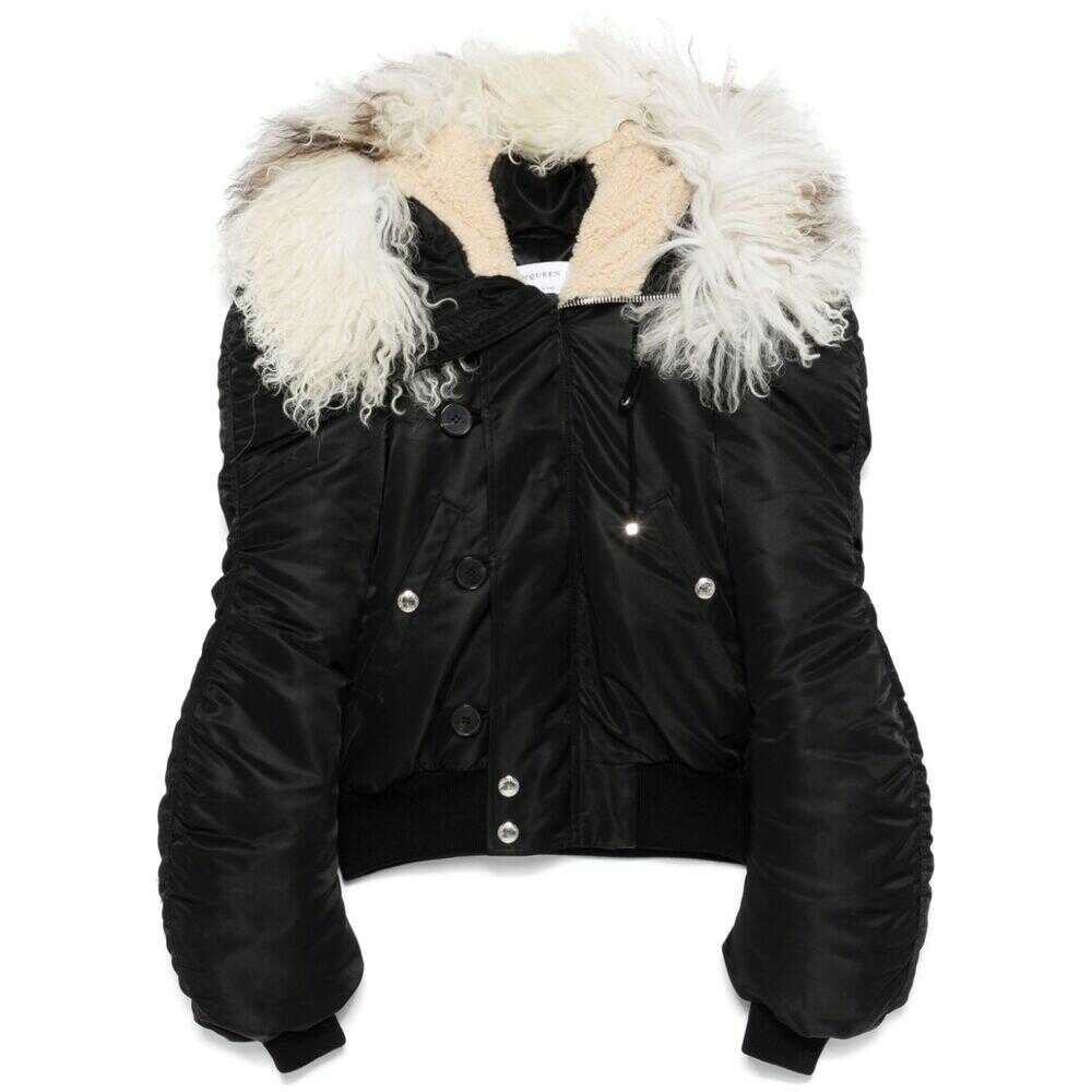 Black shearling collar front button and zip fastening padded design shearling trim classic hood long sleeves ribbed cuffs and hem two press-stud fastening side pockets straight hem