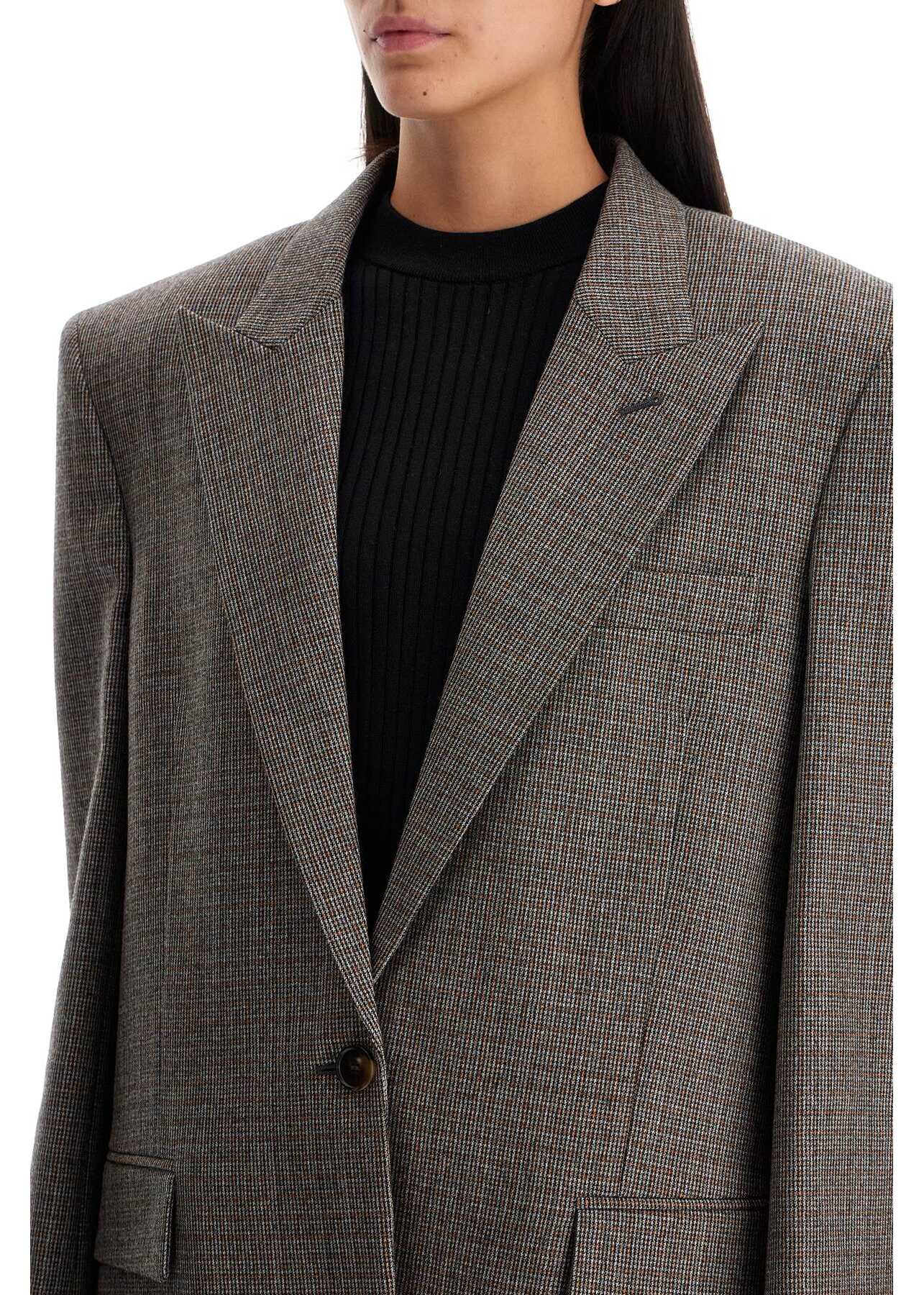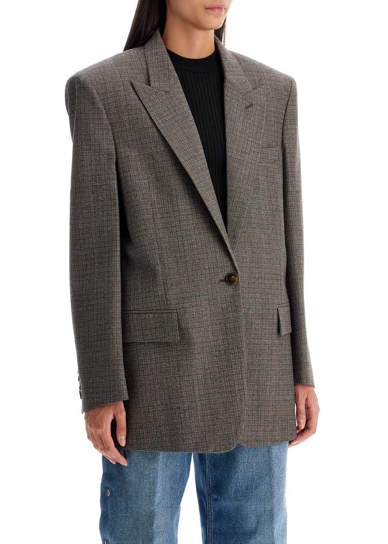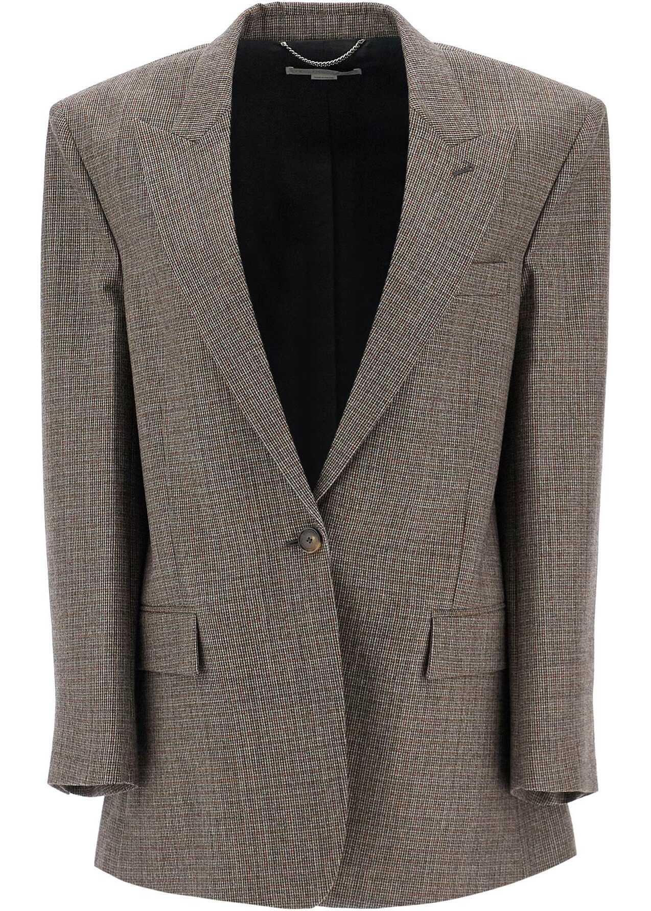 Crafted in pure RWS houndstooth wool, this Stella McCartney blazer features an oversized masculine cut enhanced by padded and structured shoulders. It boasts a single-breasted design with a one-button closure. The blazer also includes peak lapels, buttoned cuffs, and flap pockets, two of which have flaps. Lined and equipped with an internal pocket, it is finished with a central back vent. The model is 177 cm tall and wears an IT size 40.