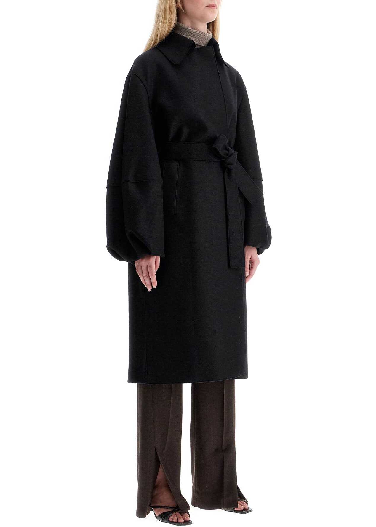 The Harris Wharf London long coat is made of pure pressed virgin wool, featuring a wrap design with a collar, tie belt, and dropped puff sleeves. The welt pockets and raw edge finishes complete the design. Unlined interior. The model is 177 cm tall and wears size IT 38.