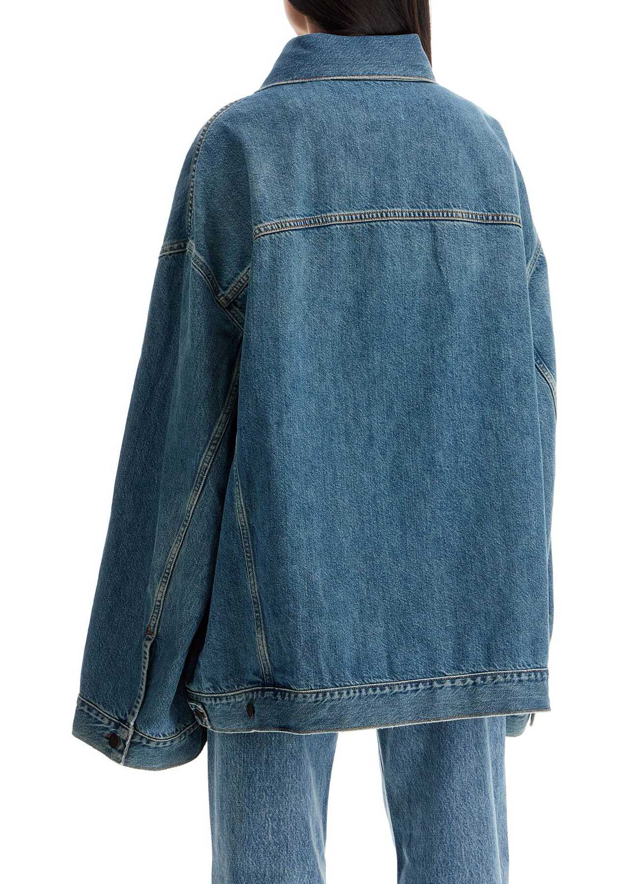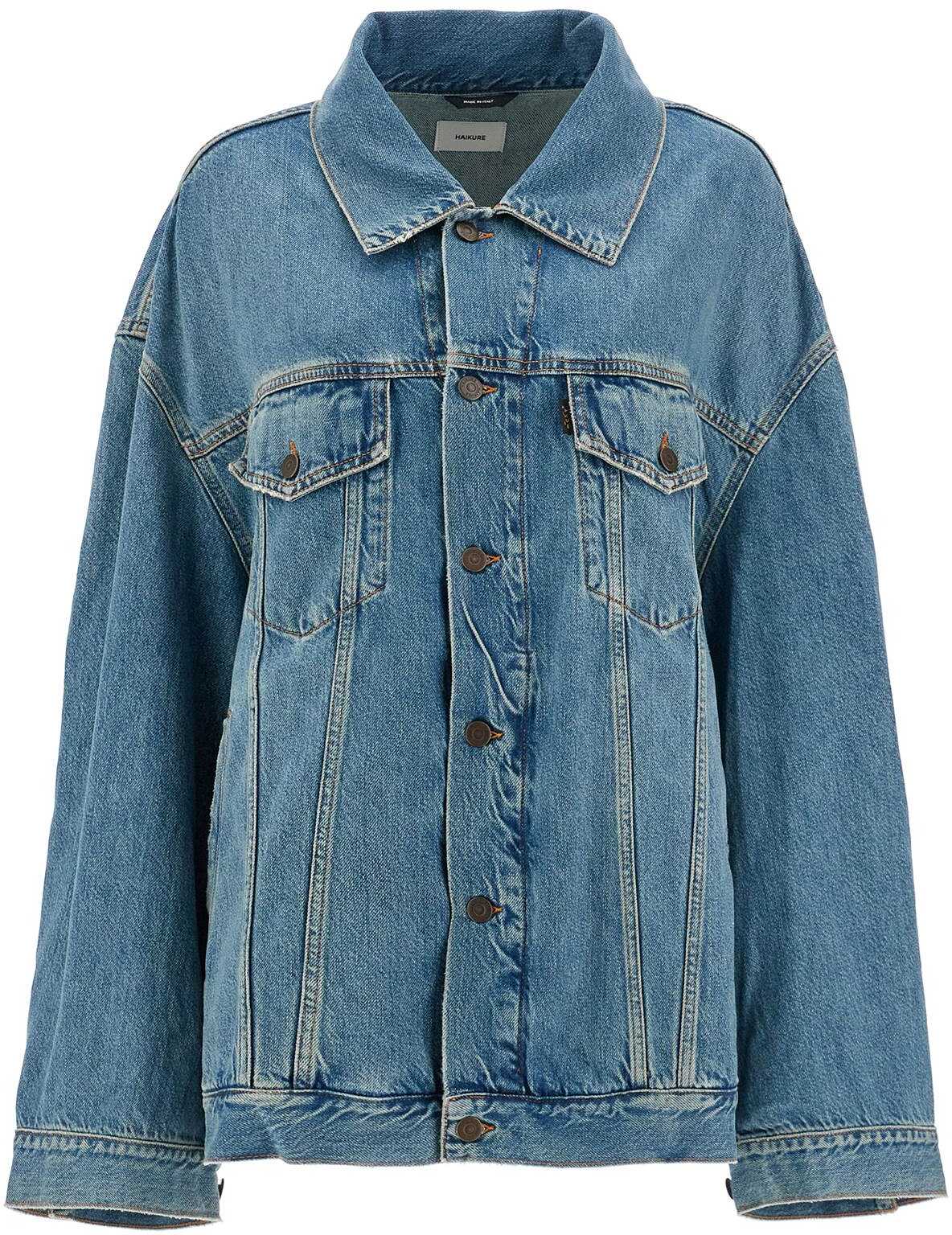 The Janet jacket by Haikure is made of soft vintage medium-washed denim, with an oversized fit enhanced by wide low-set sleeves that can be adjusted at the bottom with straps and back tabs. It features a classic collar, front button closure, and slanted welt pockets. Completed with flap pockets on the chest, signed with a logo jacron on the back. The model is 177 cm tall and wears a size S.