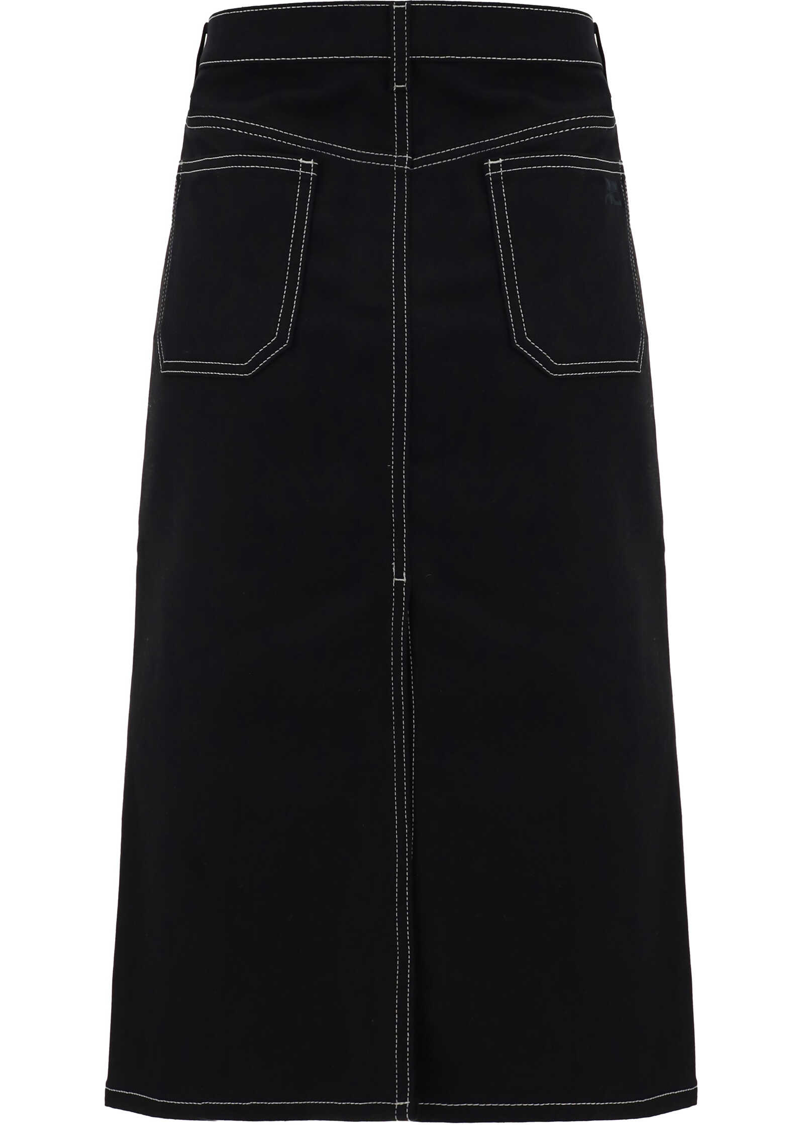 Cotton Denim Skirt by Courrèges, front button and zipper closure, two patch welt pockets on front panel, two patch slit pockets on back panel, back panel slit, waistband loops, contrast stitching, monochrome pattern, regular fit.