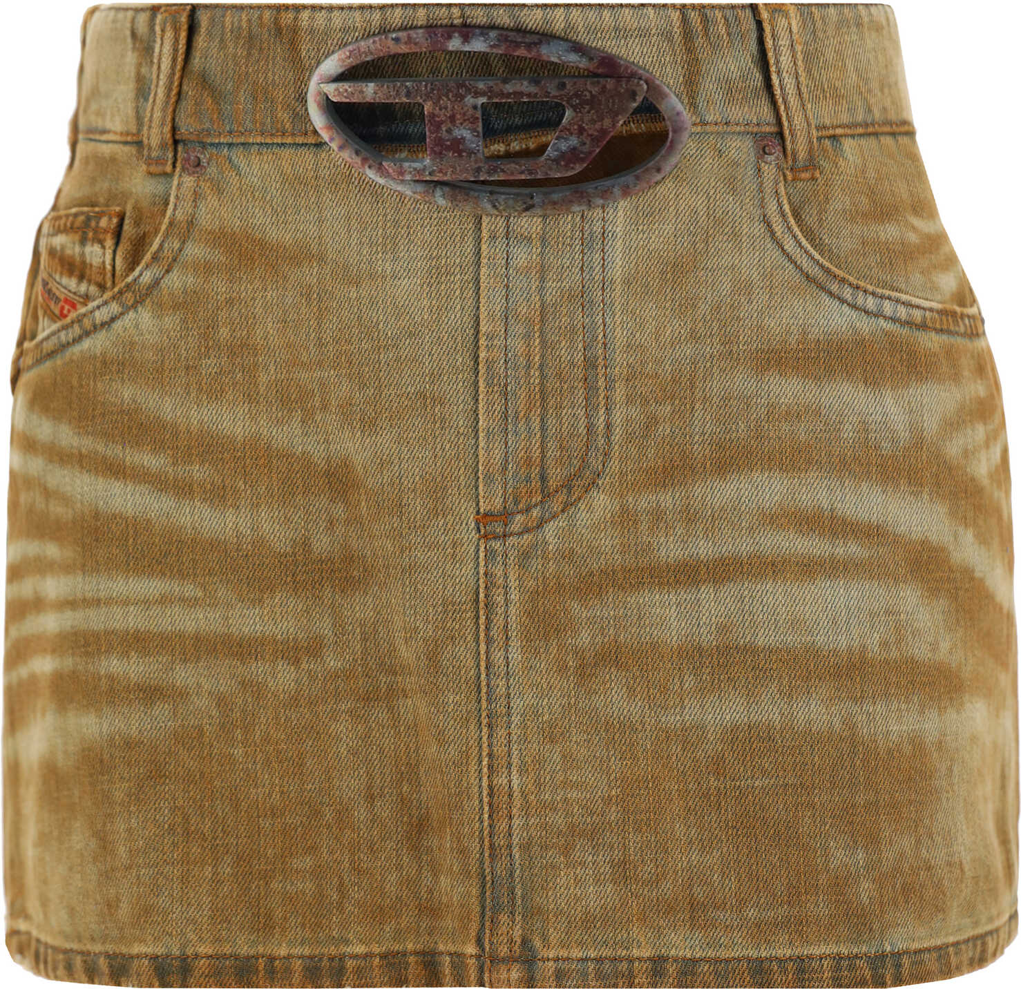 Cotton Denim Miniskirt by Diesel, side zipper closure, two welt pockets on front, cut-out detail with iconic brand logo applique on front, vintage worn effect design.