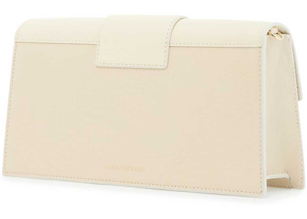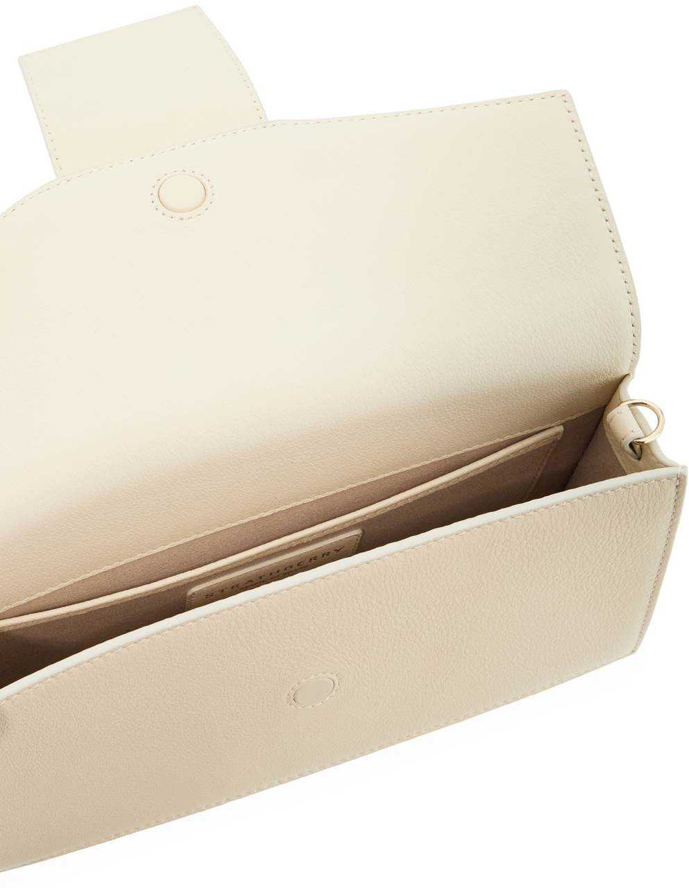 The Mini Crescent Bag by Strathberry is made of smooth leather and features the iconic curved bar with asymmetric spheres at the ends. It can be worn over the shoulder with the leather handle or crossbody with the removable chain strap. The flap has a magnetic closure, and the gold lettering logo is printed on the back. The interior is lined with microfiber suede and has an open flat pocket. The metal accessories have a gold finish.