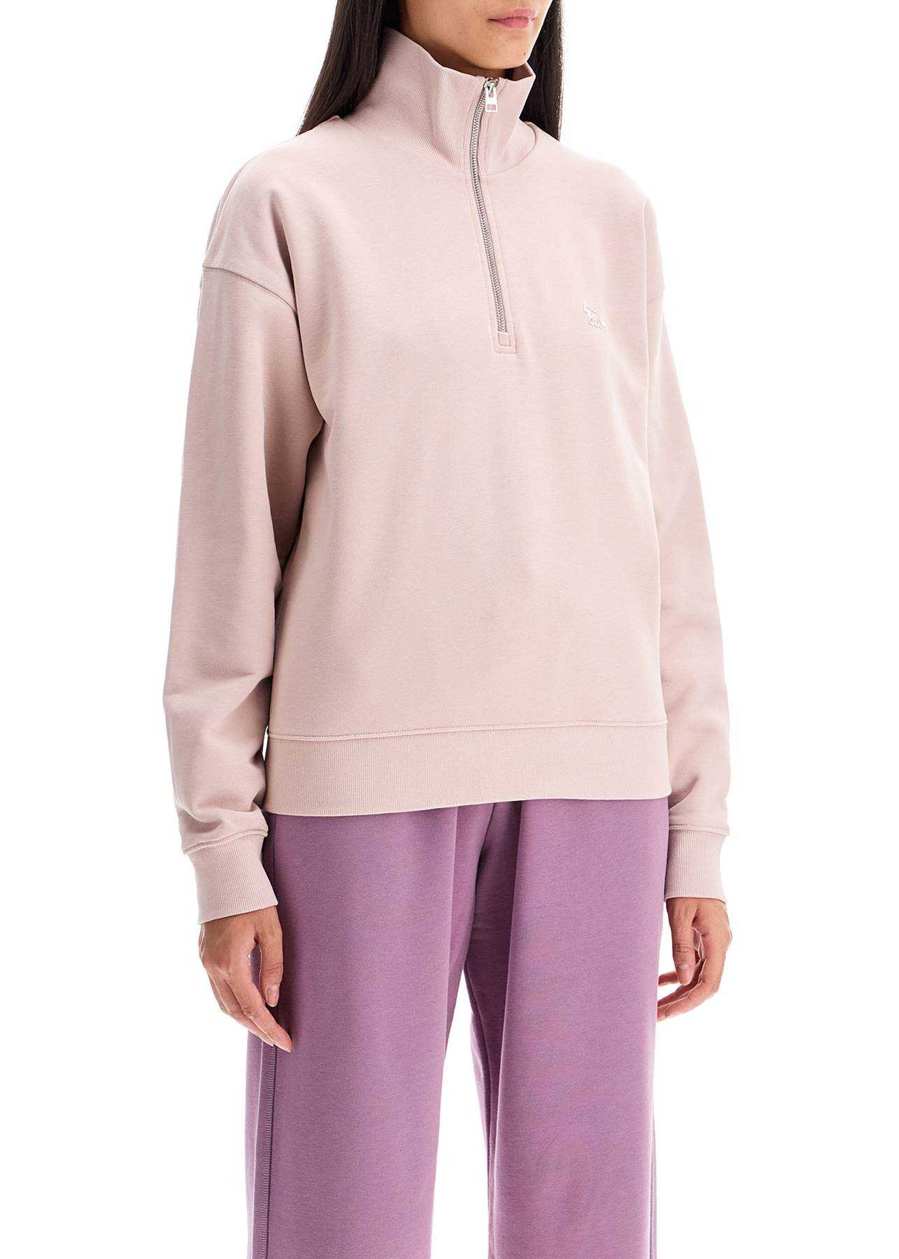 This Maison Kitsuné sweatshirt is made of pure cotton brushed jersey and features a characteristic embroidered Baby Fox patch in tone on the chest. It has a convertible high collar with half zip and ribbed finishes. The fit is boxy with a relaxed fit and low round sleeves. The model is 177 cm tall and wears an XS size.