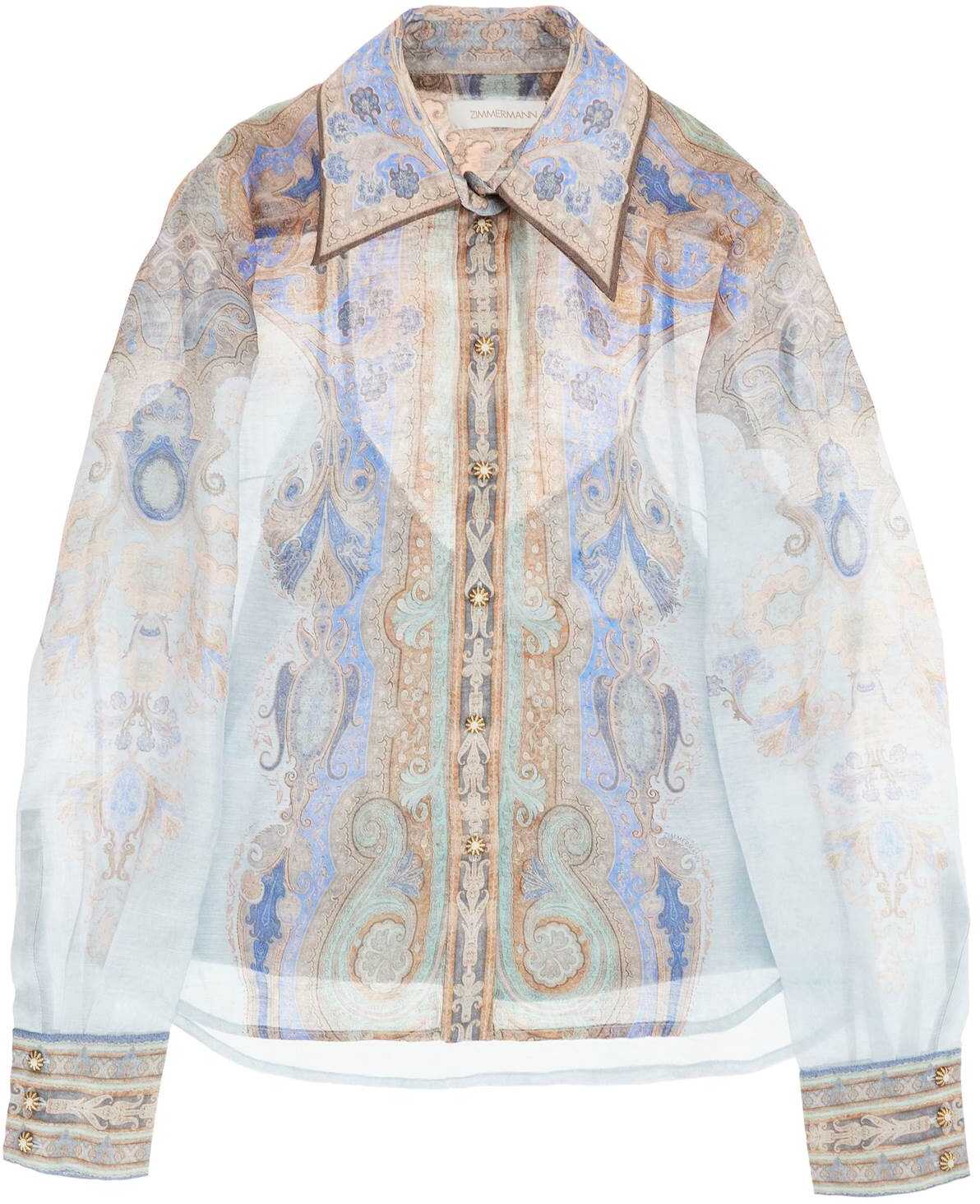 Zimmermann linen and silk organza shirt with paisley prints. Features a classic pointed collar, three-button cuffs, and decorative button closure. Removable jersey camisole top inside. The model is 177 cm tall and wears size 1.