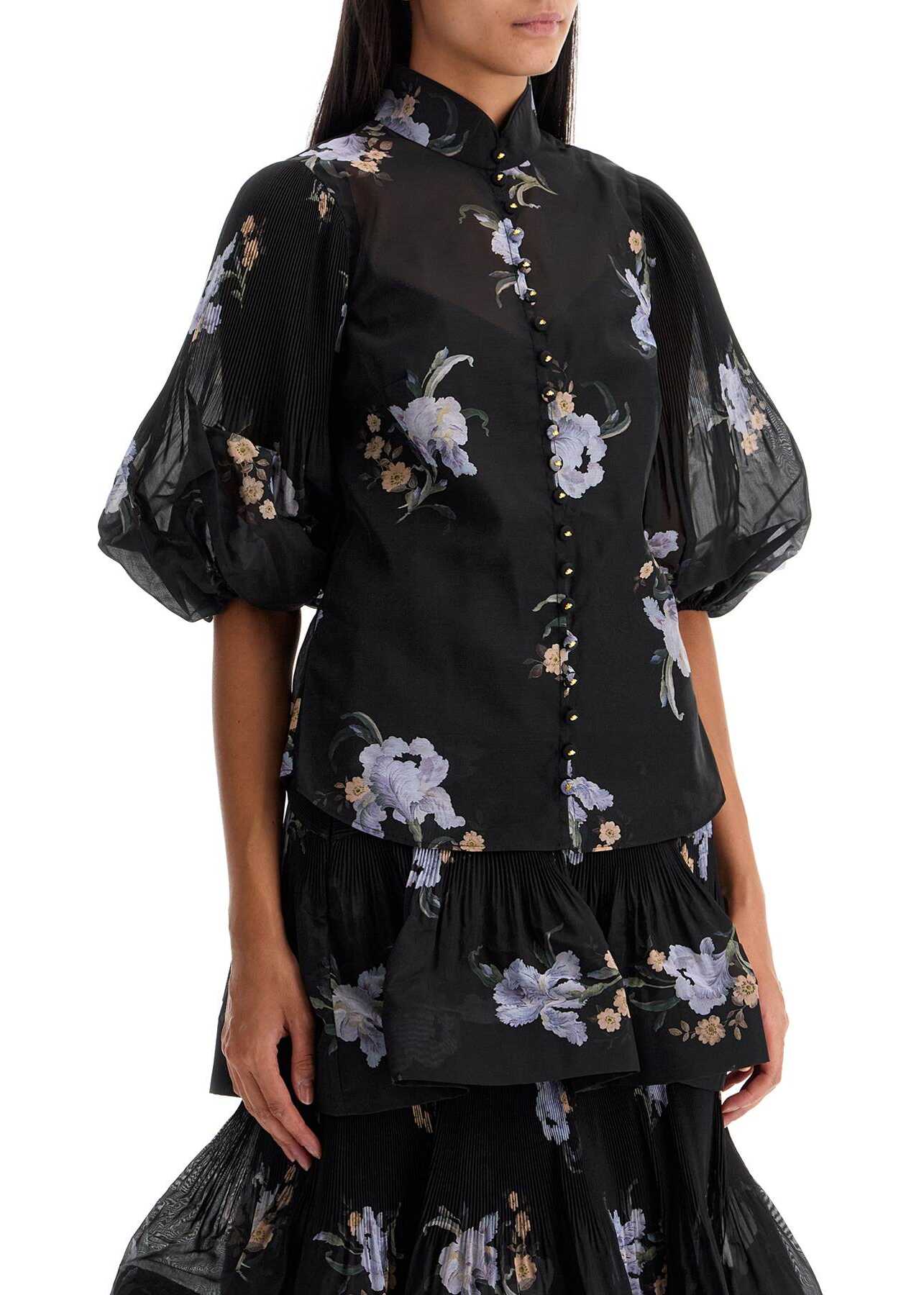 Crafted in smooth, shiny organza with a floral print, this Zimmermann blouse stands out for its pleated balloon sleeves and mandarin collar. The front features a row of buttons covered with jewel details. Invisible zipper on the back, removable jersey camisole top. The model is 177 cm tall and wears size 0.