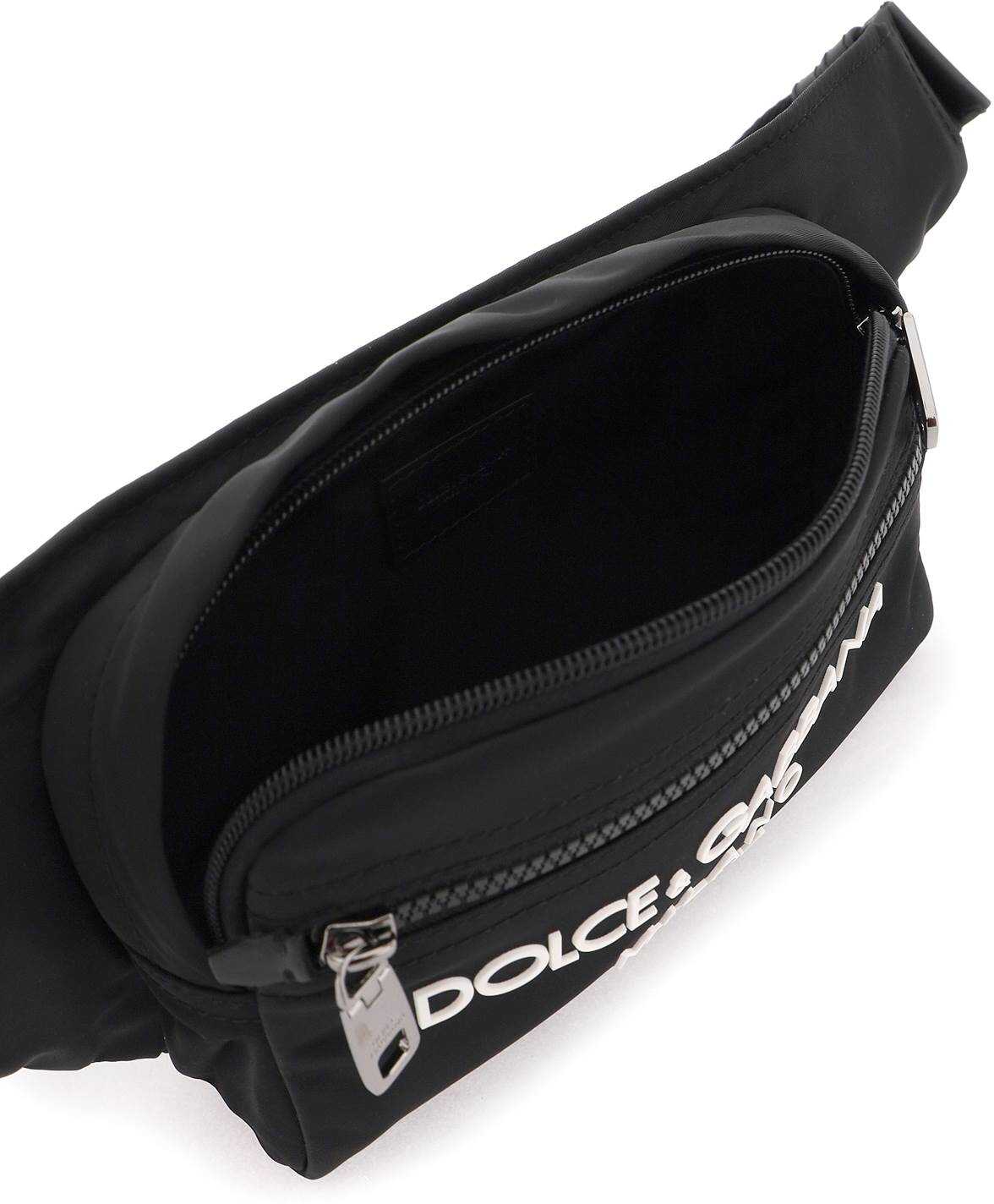 Dolce & Gabbana beltpack crafted in nylon with contrasting rubberized logo on front. Adjustable ribbon belt with leather loop and metal tuc buckle with engraved logo. Rear and front zippered pocket, transparent badge pocket on the back, zip closure and nylon lining. Ruthenium-finished metalware.