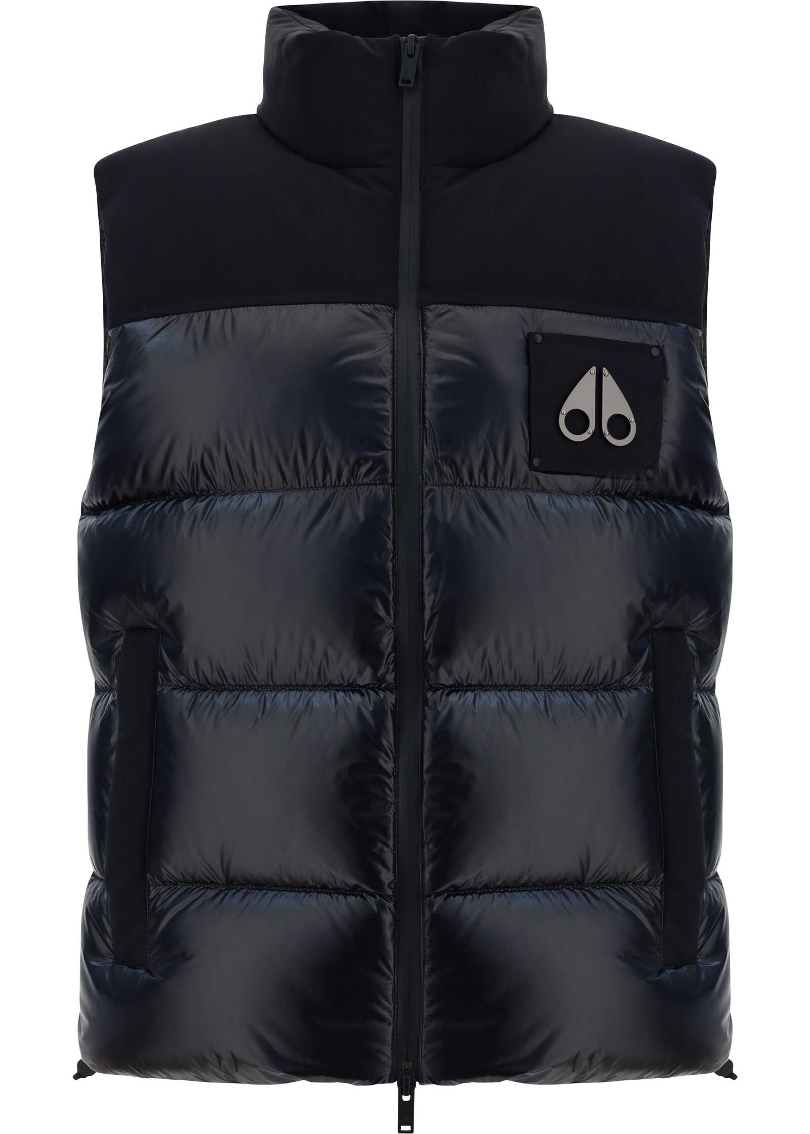 Victory Peak Padded Vest by Moose Knuckles, front zipper closure, high collar, padded and quilted design, patch with iconic three-dimensional brand logo applique on front, two side welt pockets, elastic ribbed hem.