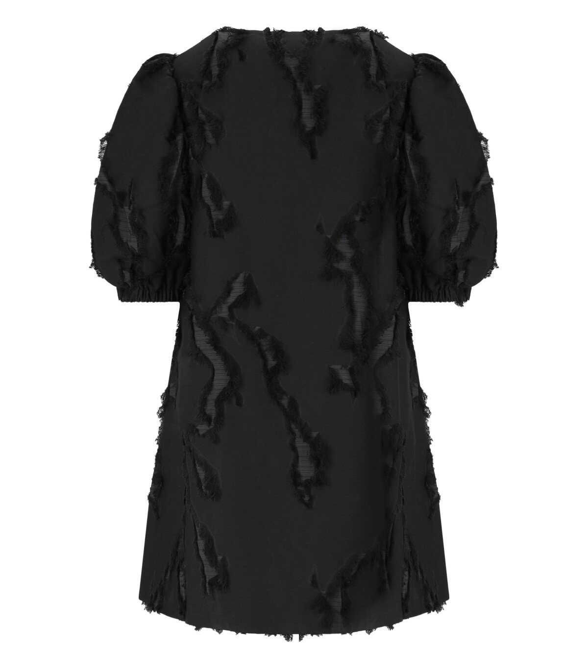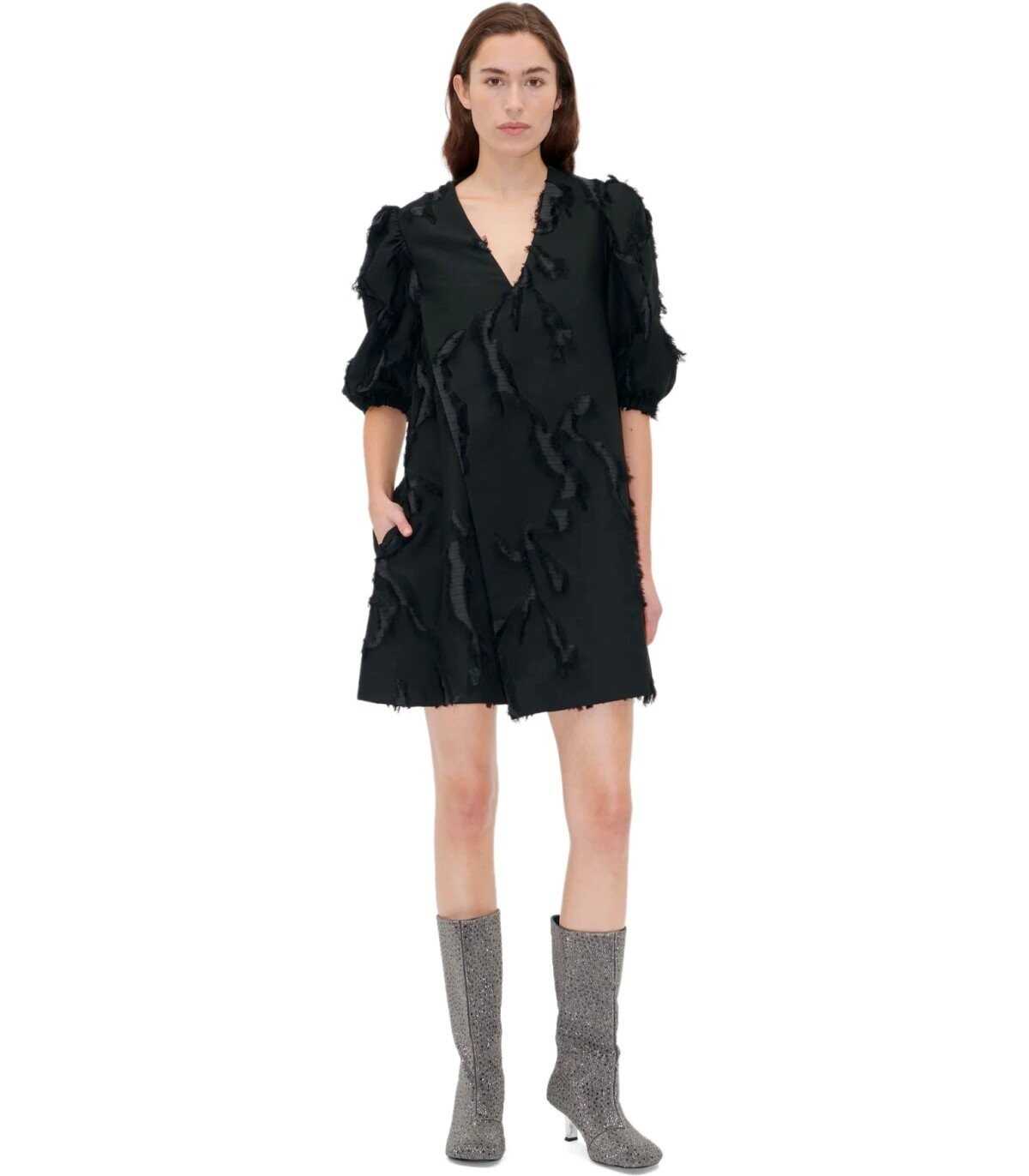 Dress by Stine Goya made of black viscose blend, with frayed effect applications, V-neckline, and balloon sleeves. Hidden pockets on the sides, loose fit.