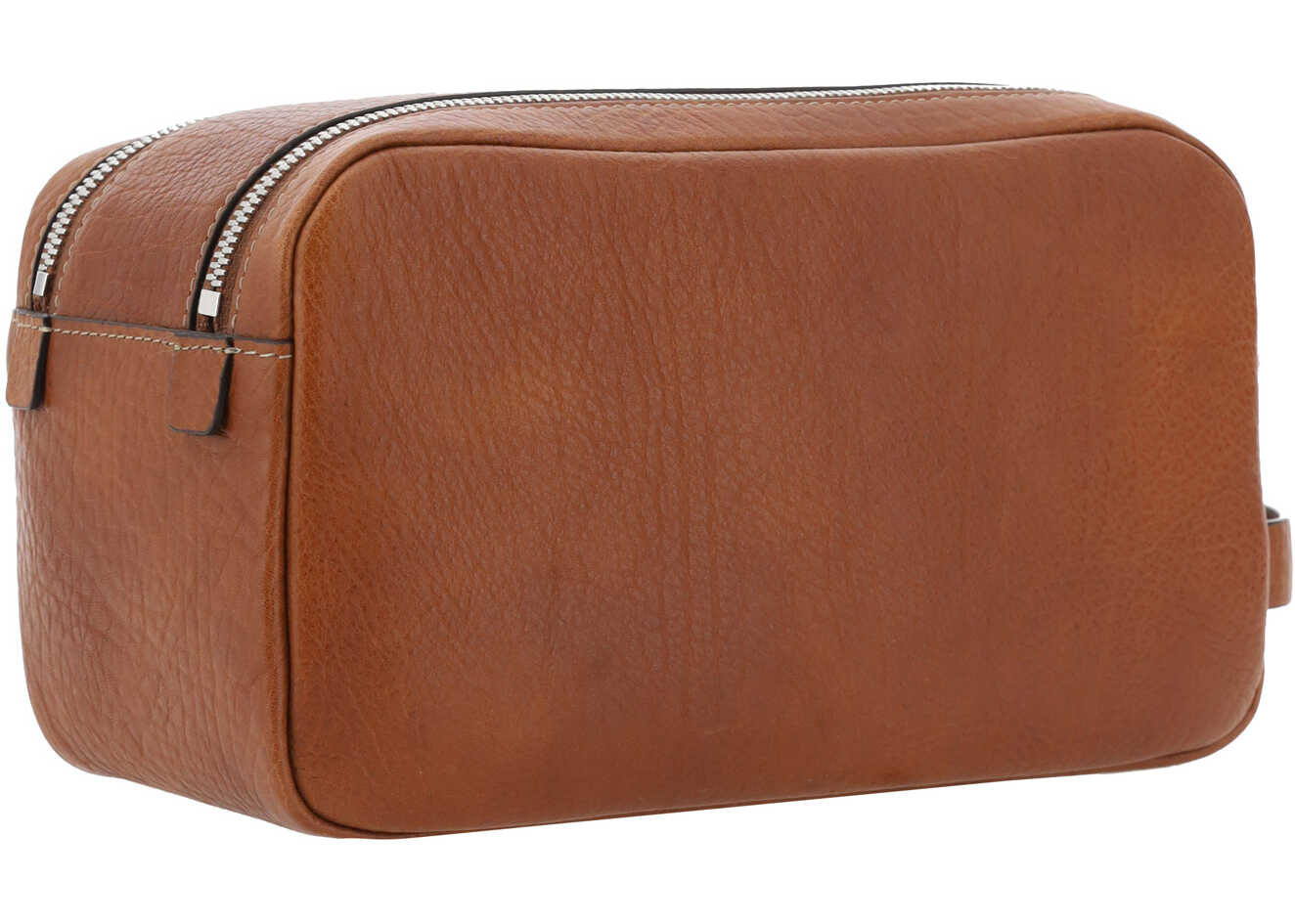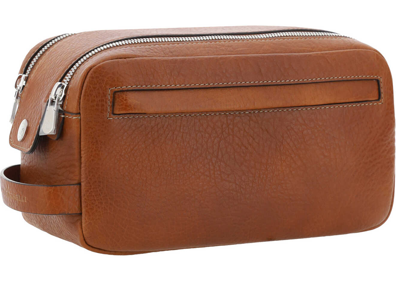 Leather Beauty Case by Brunello Cucinelli, grained leather design, double top zipper closure, single interior compartment, one welt pocket on front with zipper.