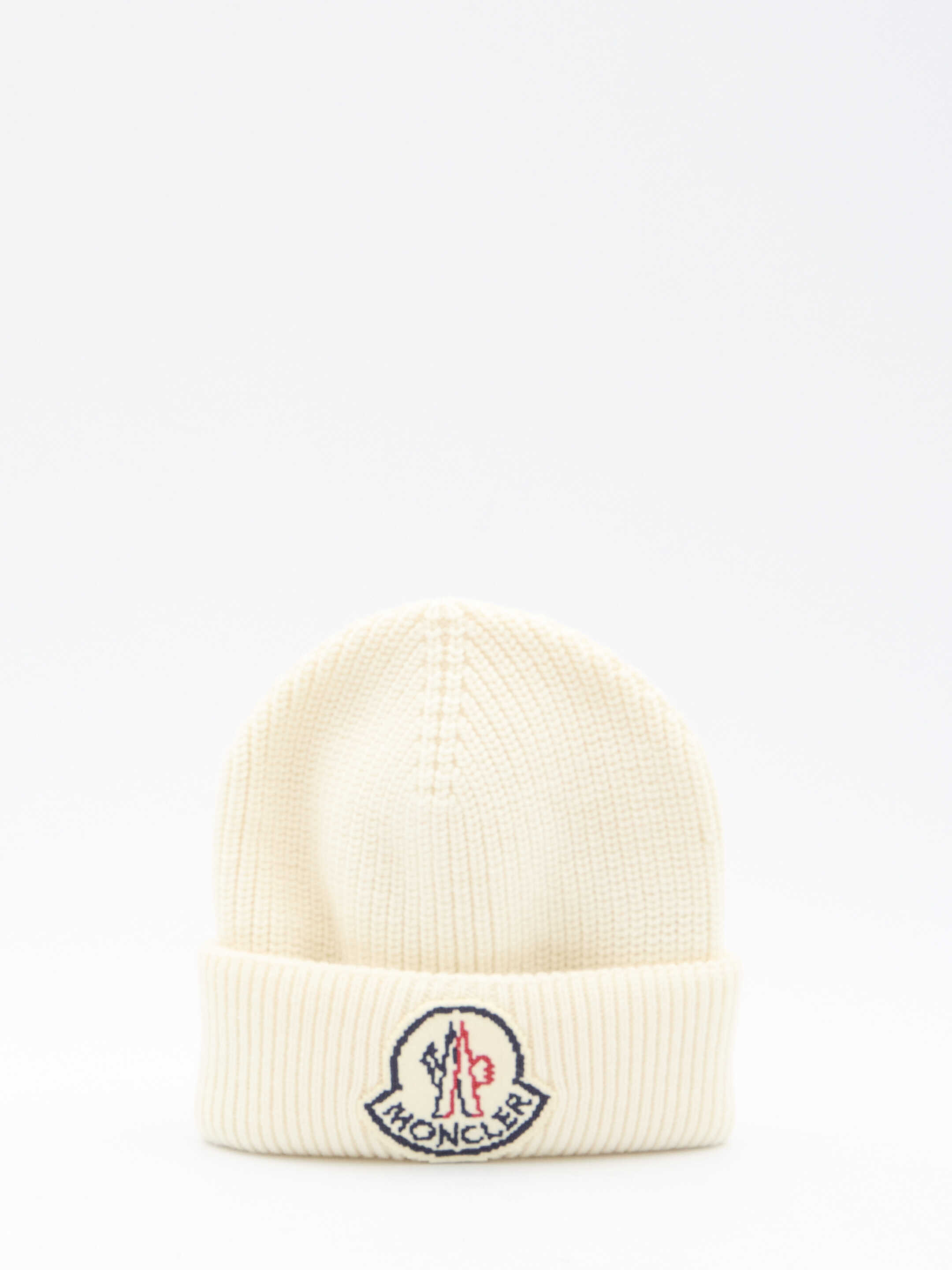 Beanie in ivory tricot virgin wool. It features Moncler patch on the front and cuffed hem.