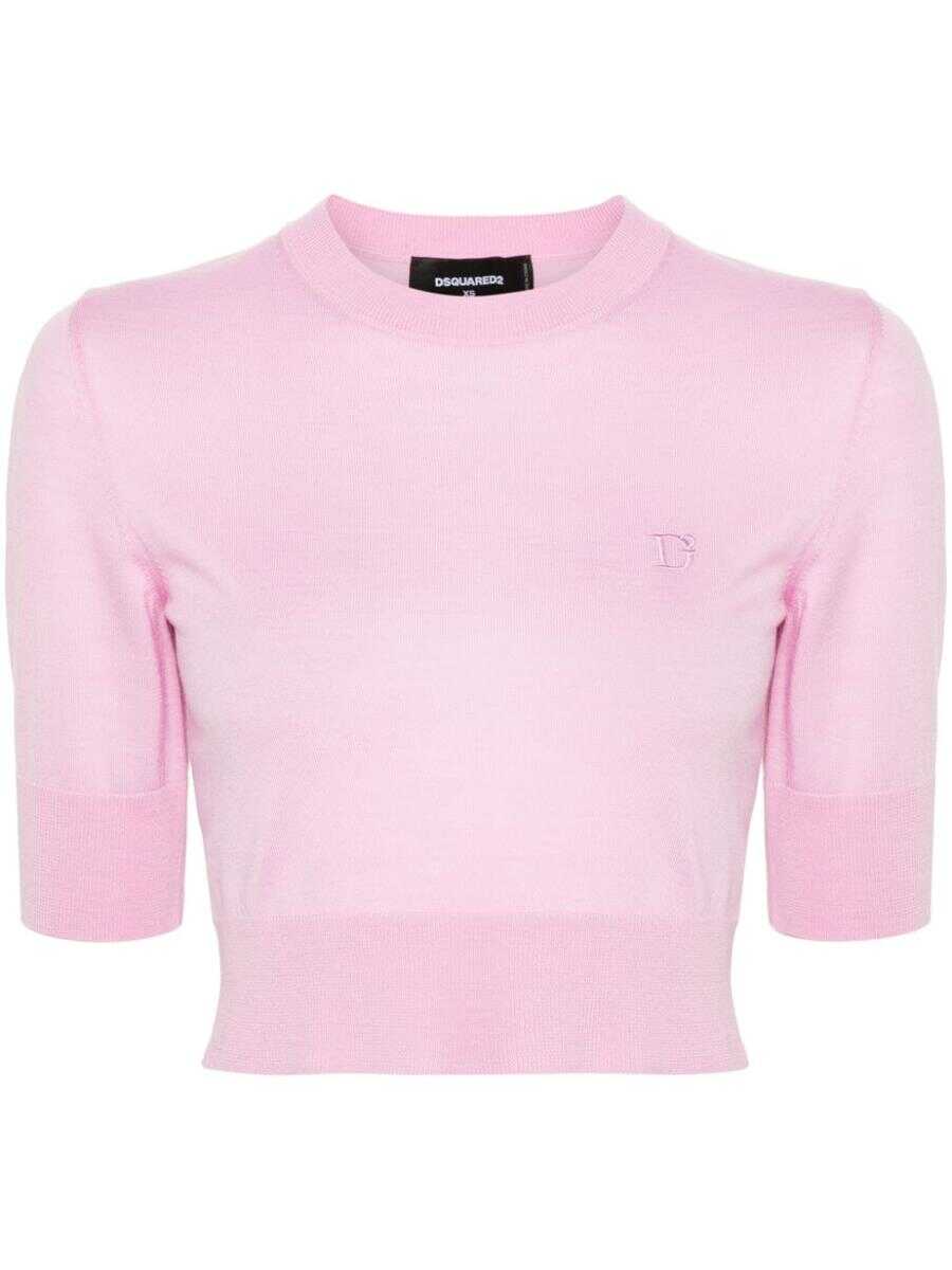 pink virgin wool fine knit embroidered logo at the chest crew neck short sleeves ribbed cuffs and hem cropped