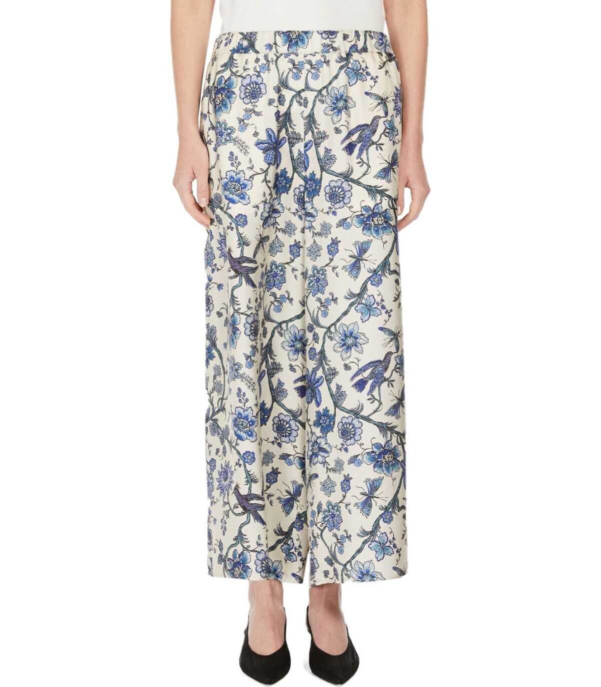 Ivory silk twill trousers from Max Mara Weekend, decorated with a floral pattern in shades of blue. Elasticized waist and straight leg, soft fit.