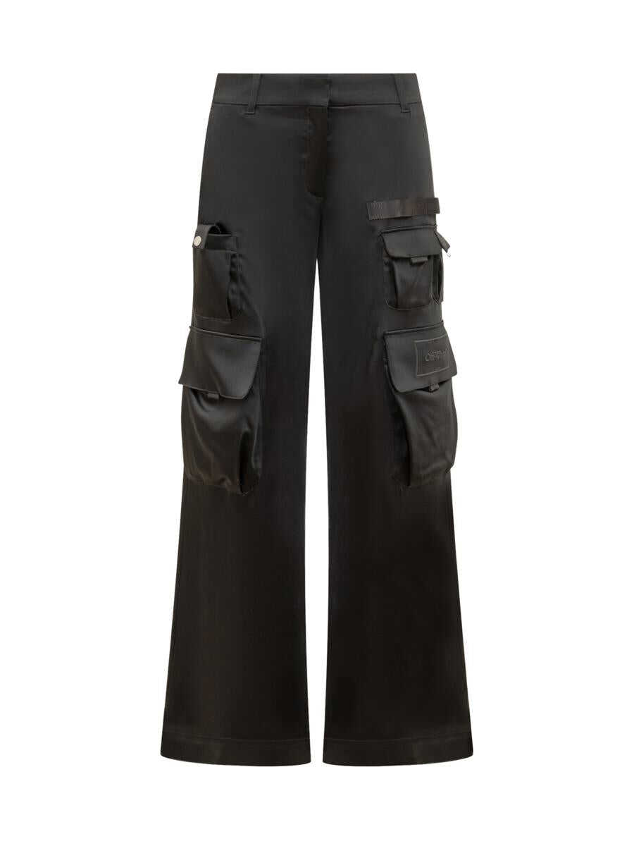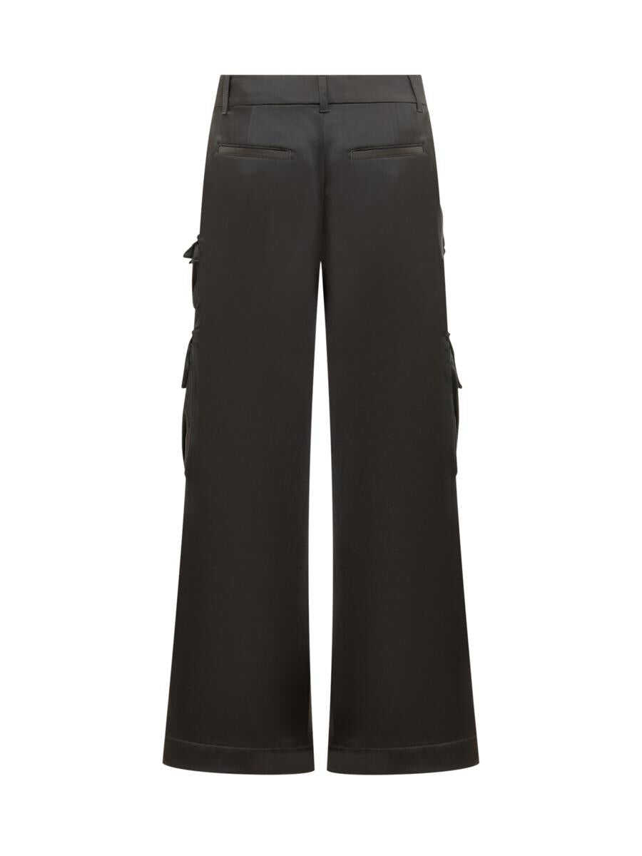 Black satin cargo pants. Button, hook and zipper closure. Flush pockets on sides. Flap pockets sewn on back. Cargo pockets. Oversize fit.