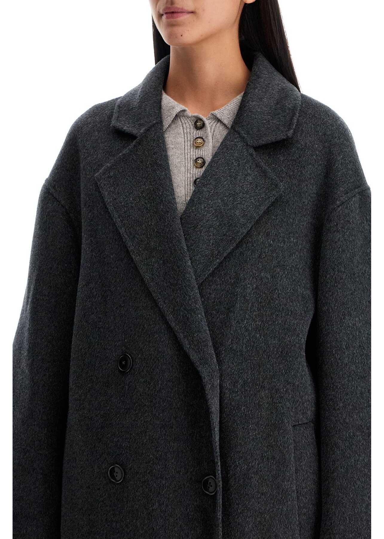 This Loulou Studio coat is made of soft wool and cashmere fabric with an unlined, deconstructed double-breasted design. It features wide flared sleeves, a notched lapel, flap pockets, and is finished with a deep center back slit. The fit is relaxed with a length that falls below the calf. The model is 177 cm tall and wears a size XS.