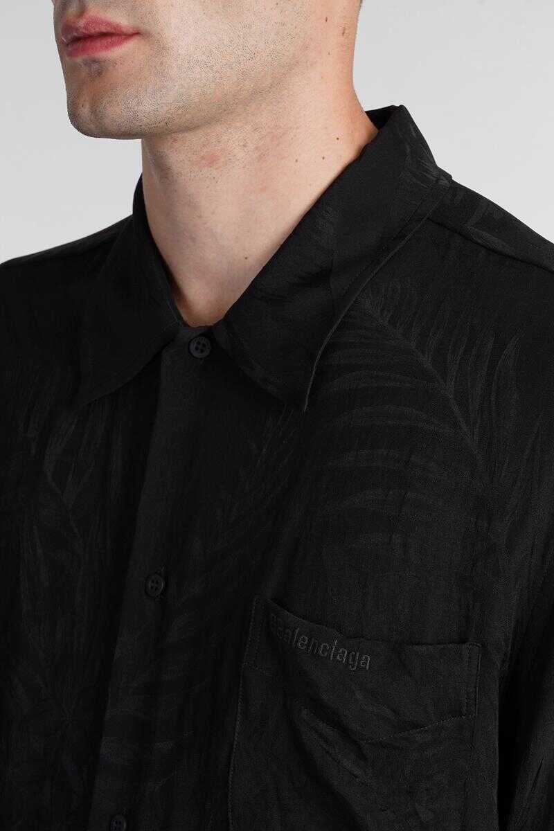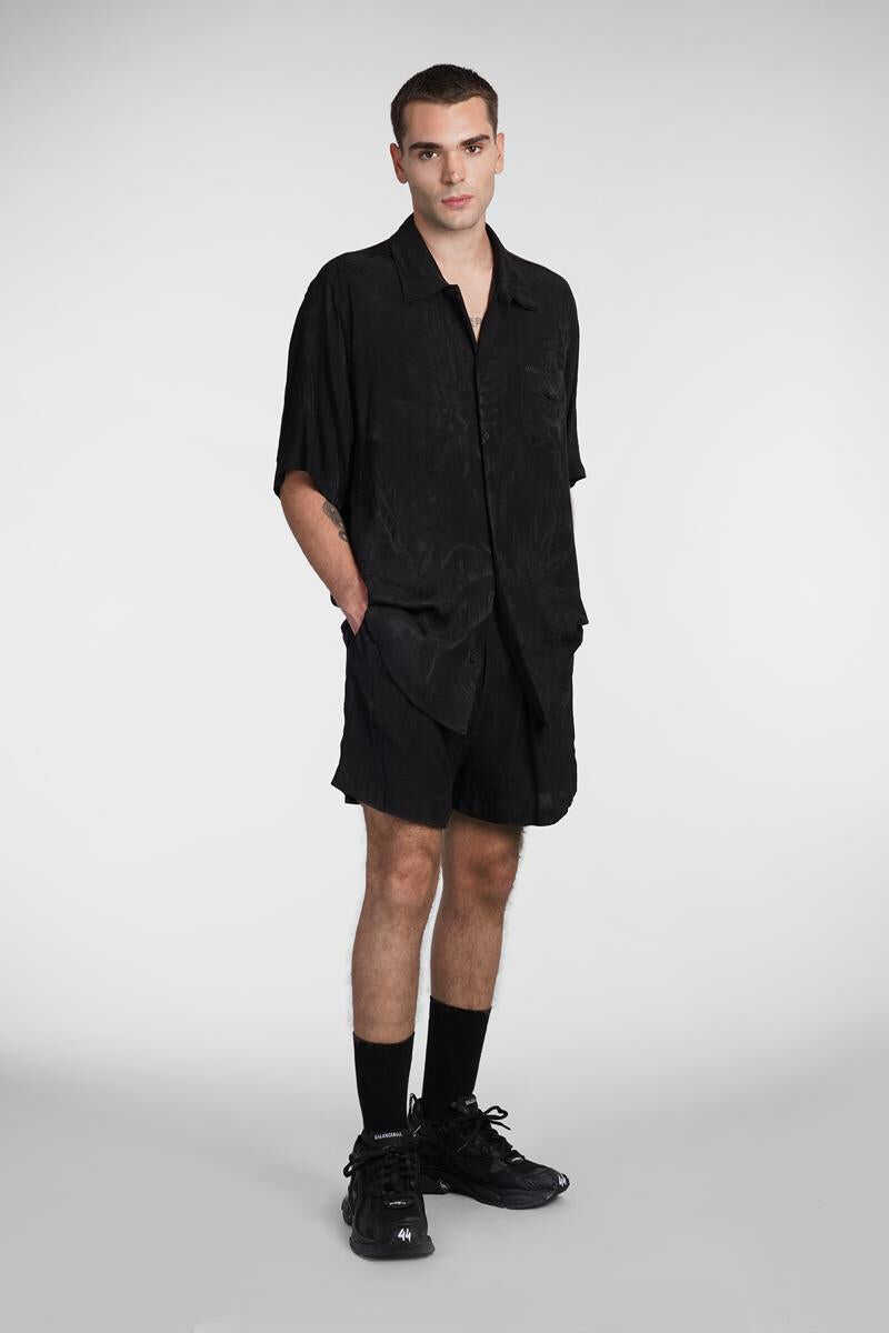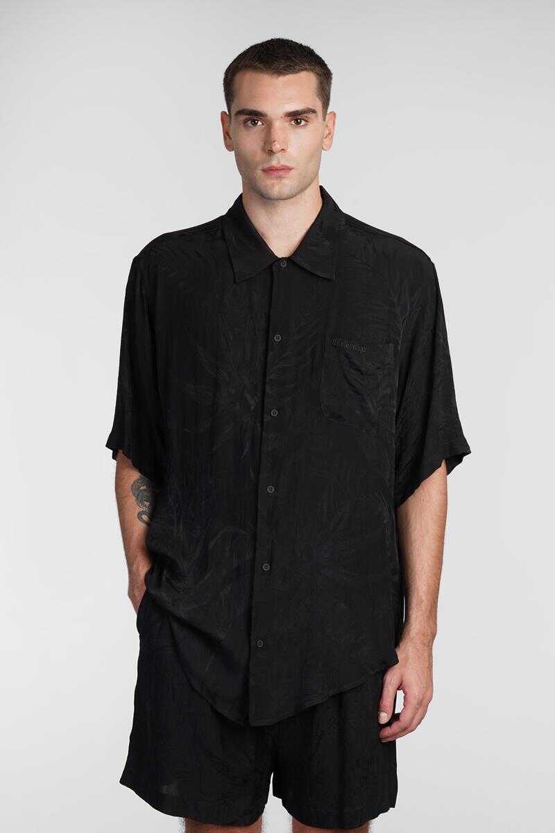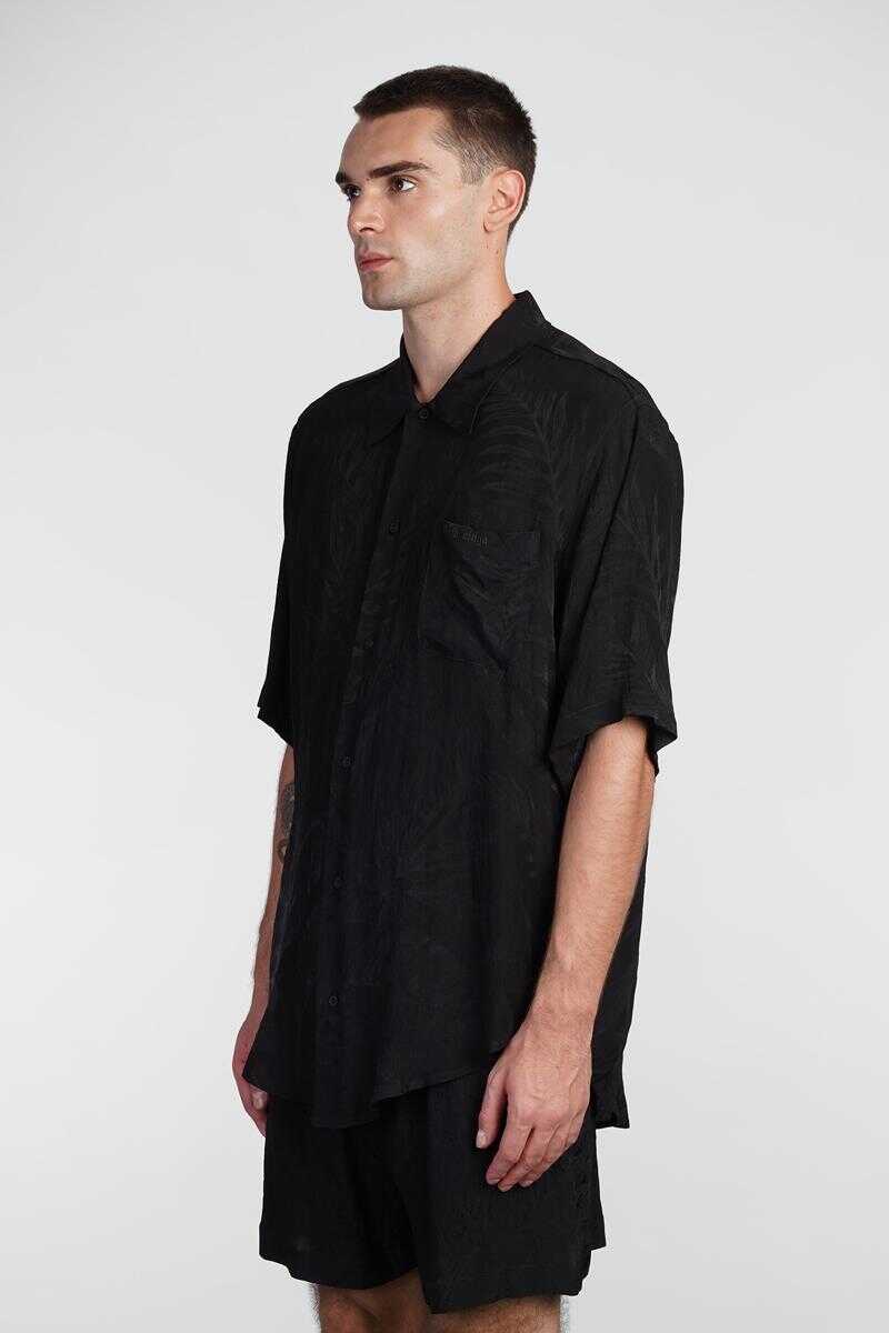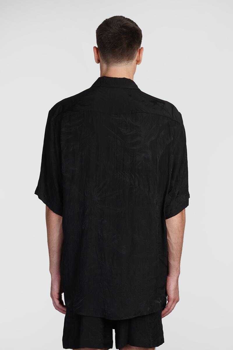 Shirt in black silk, collar, frontal buttoning, short sleeves, breast pocket, jacquard lavoration, jacquard fabric, curved hem, 100% polyester, Made in Italy