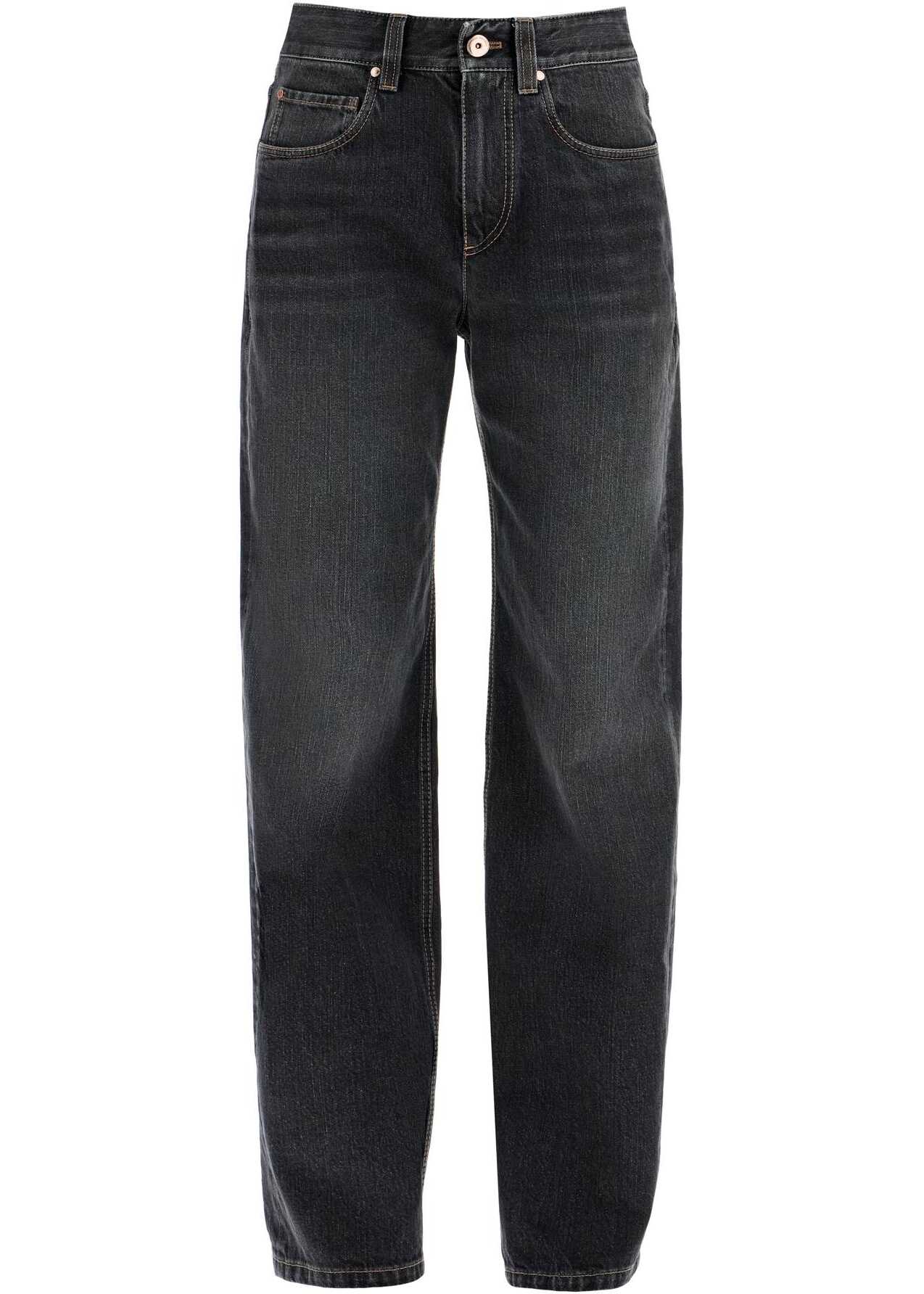These Brunello Cucinelli five-pocket jeans are made of stone washed denim for a vintage look. They are finished with contrasting stitching and a Shiny Tab detail on the back pocket, and feature a straight and relaxed fit with a medium waist. Complete with belt loops and a front zip and button closure. The model is 177 cm tall and wears size IT 38.