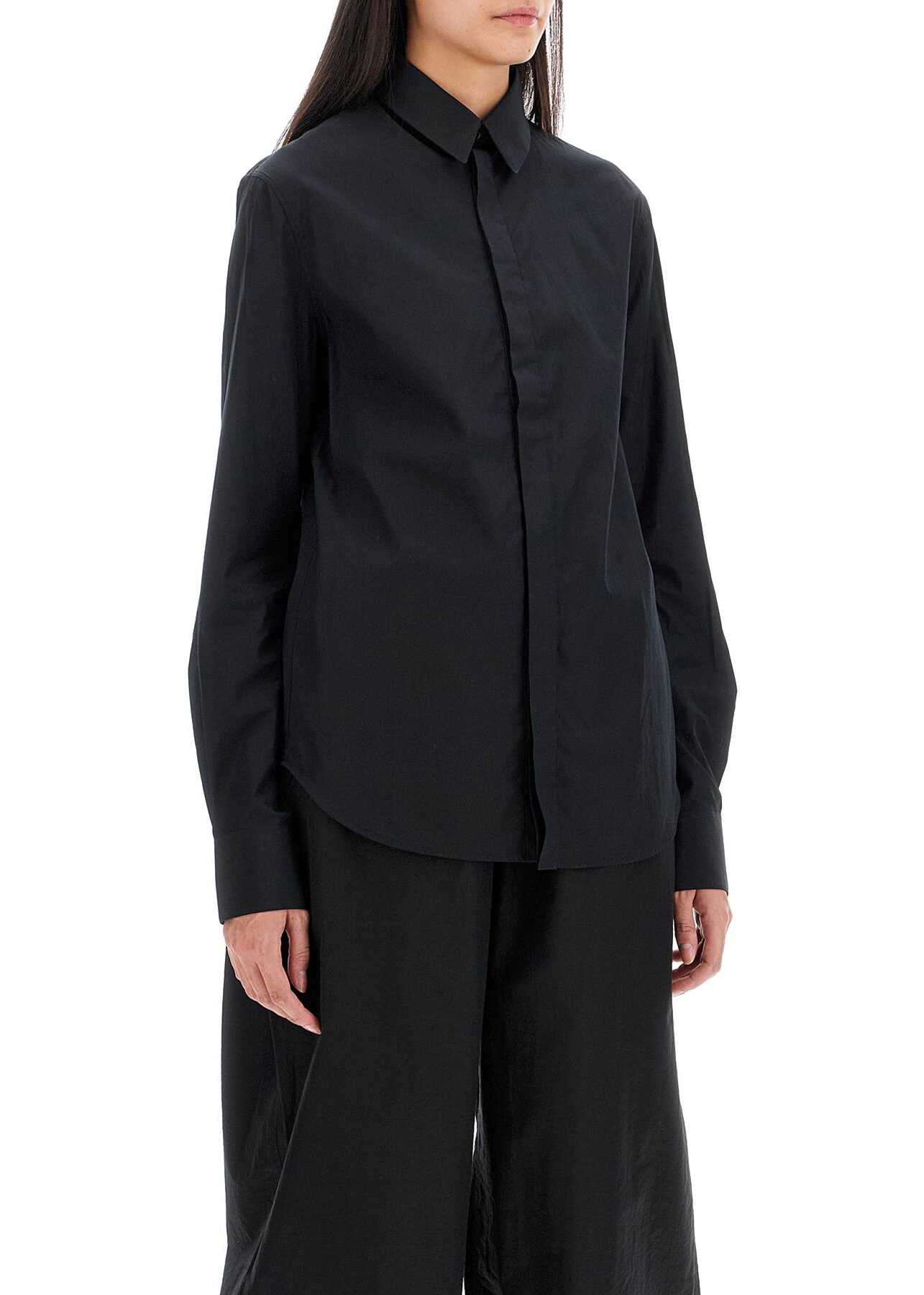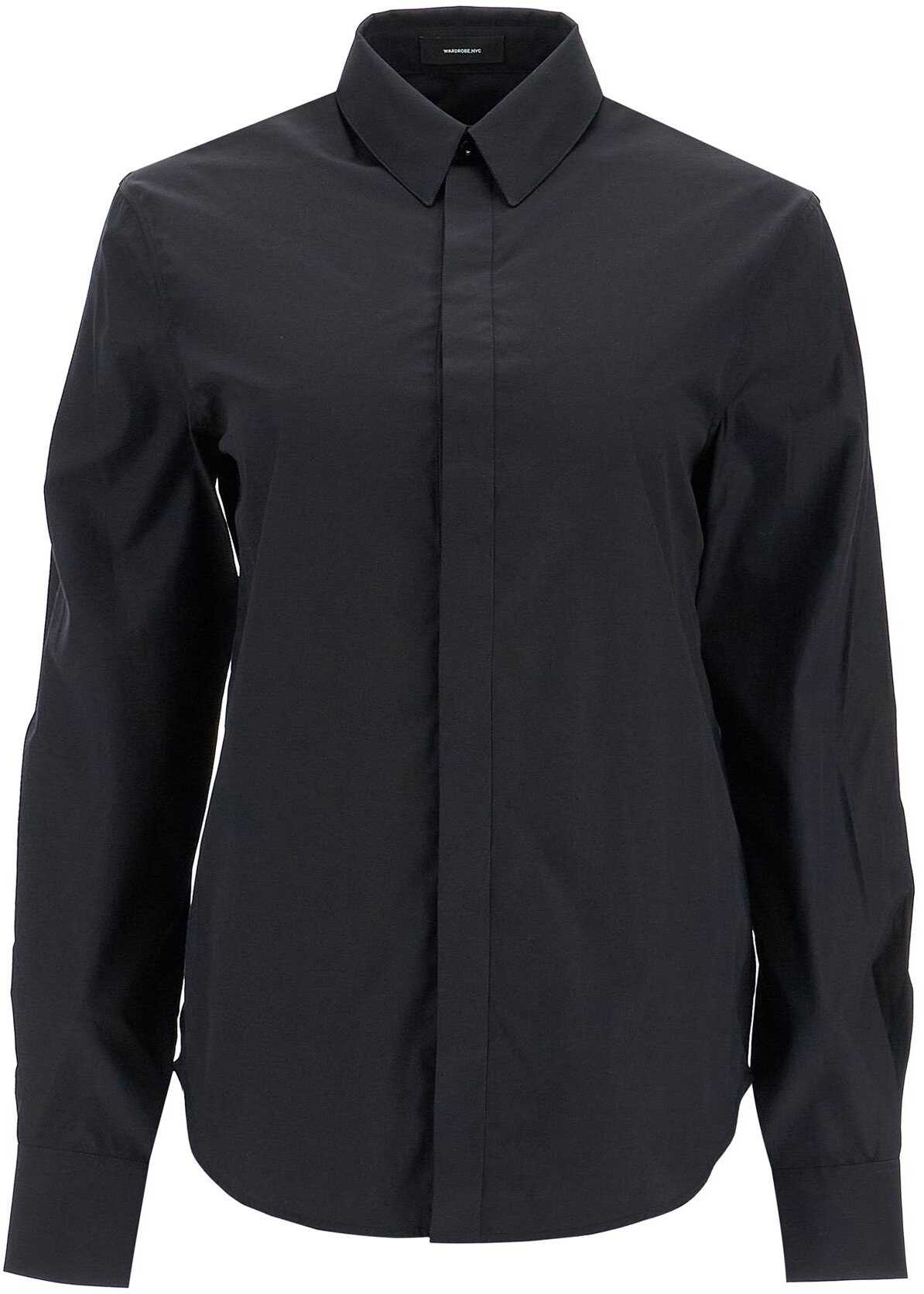 This Wardrobe.NYC shirt is made of lightweight pure cotton poplin, with a flared cut and a shaped hem. It features a classic collar, hidden front button closure, and adjustable rounded cuffs with buttons. Finished with a pleat on the back yoke. The model is 177 cm tall and wears a size XS.