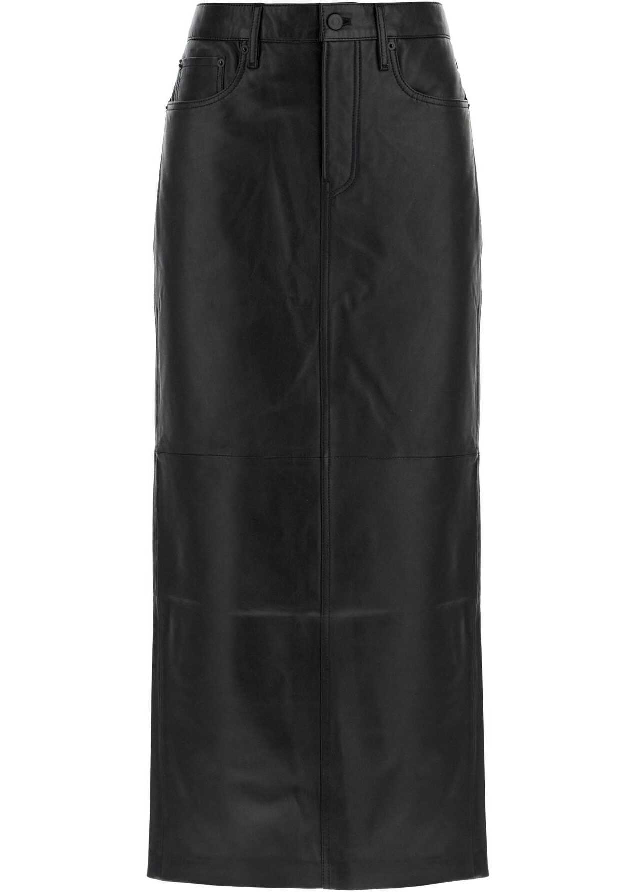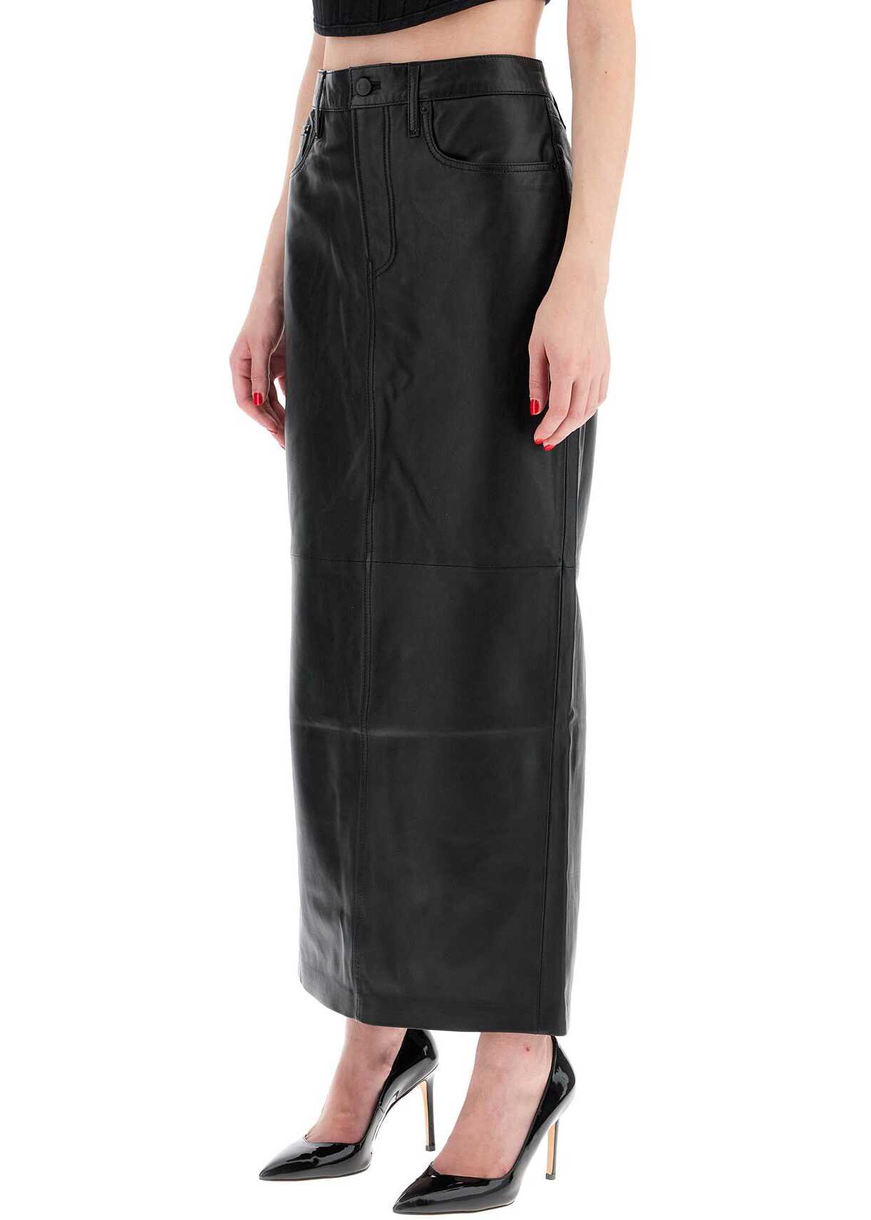 The Wardrobe.NYC skirt is made of soft leather and features a five-pocket design with a column silhouette that falls below the calf. It has a button and concealed zip closure, belt loops, and a branded jacron patch on the back waistband. Partially lined and finished with a center back slit. The model is 177 cm tall and wears a size S.