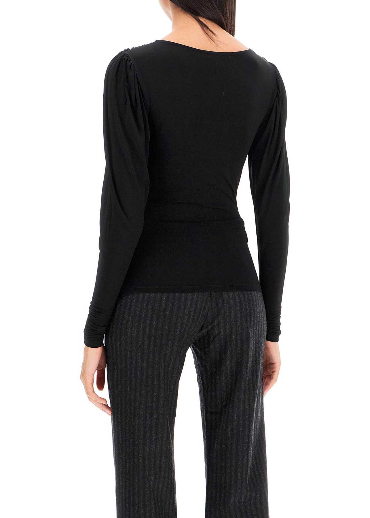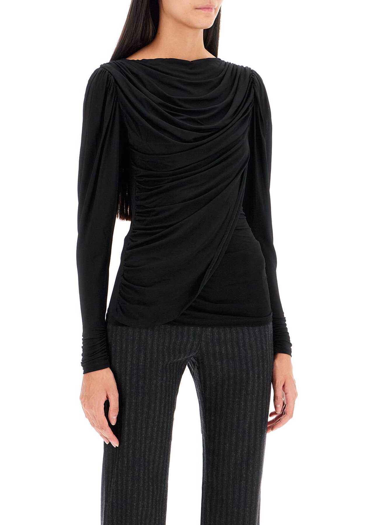 This Paloma Wool top is made of a shiny viscose blend jersey, with a fitted cut enhanced by front draping. It features a wide round neck and long gigot sleeves. The model is 177 cm tall and wears a size XS.