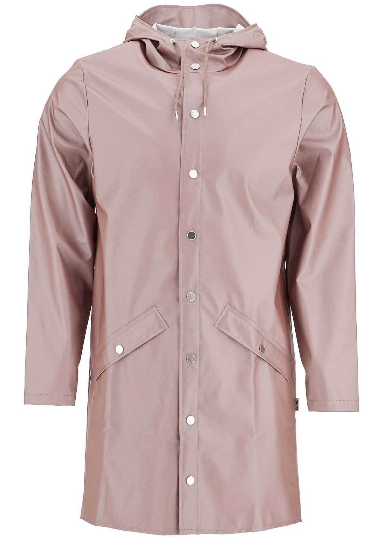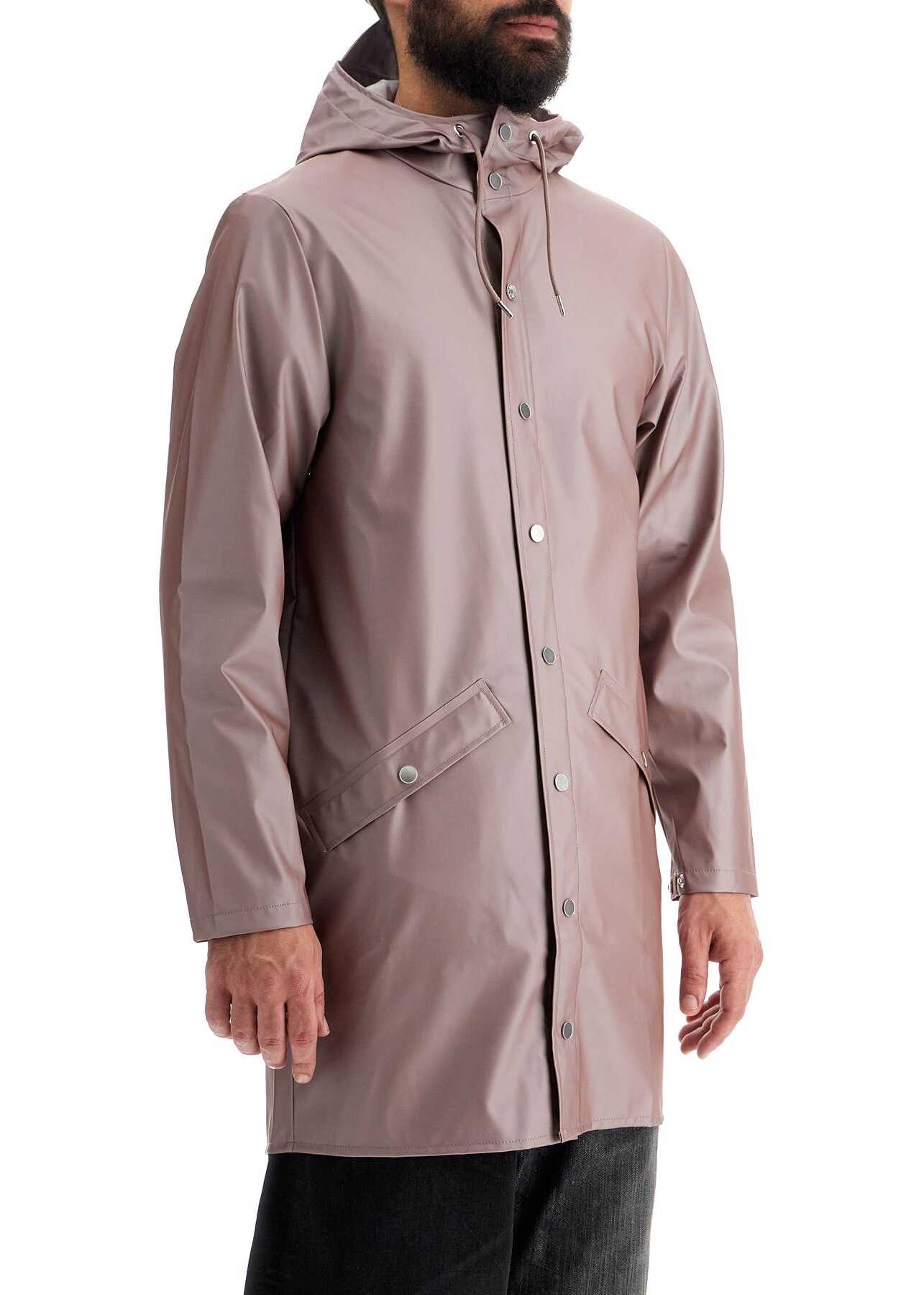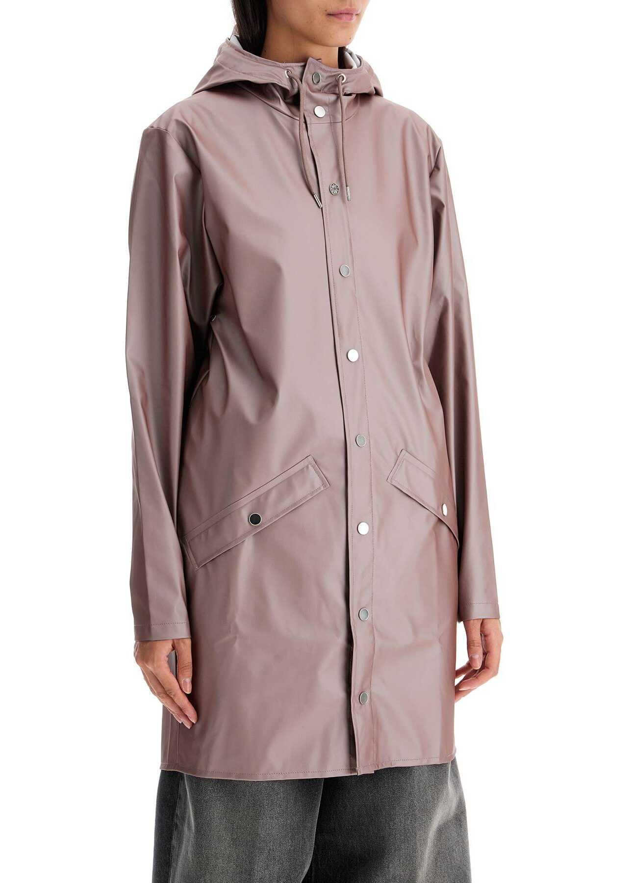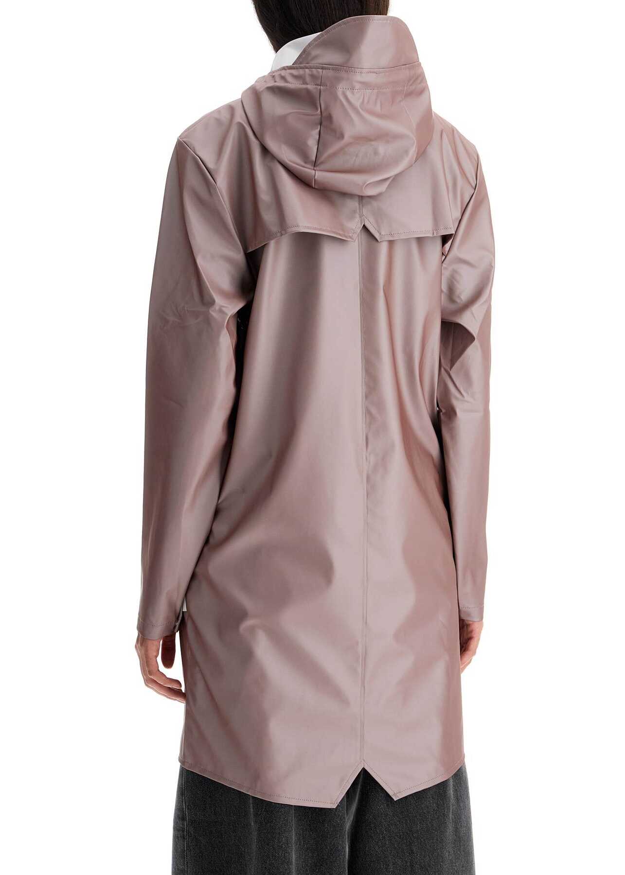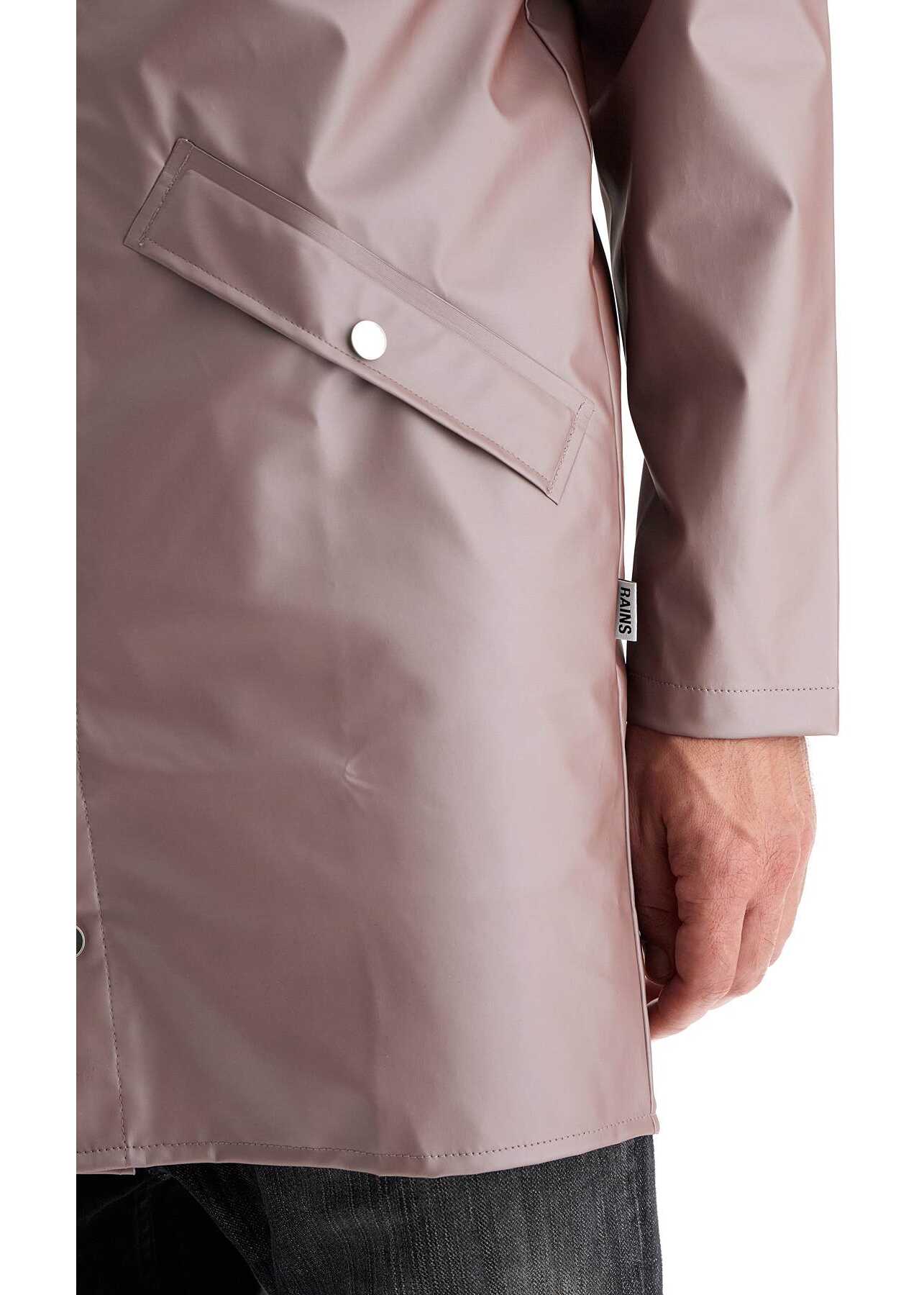 The Rains waterproof jacket is made of technical PU fabric and features a straight cut with a midi length. It has snap button closure, a hood with visor and drawstring, ventilation eyelets under the armholes and air intakes under the back flap, adjustable cuffs and side pockets with snap buttons. The chest also has a logo button detail. The model is 177 cm tall and wears size XS.