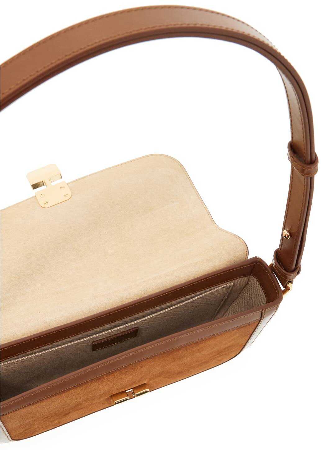 The Grace Baguette bag by A.P.C. is made of suede leather with smooth leather trims and handle. It features a metal clasp closure, a gold printed logo on the back, and an adjustable shoulder strap for both crossbody and shoulder wear. The interior is lined in cotton and has an open flat pocket. All metallic accessories have a golden finish.
