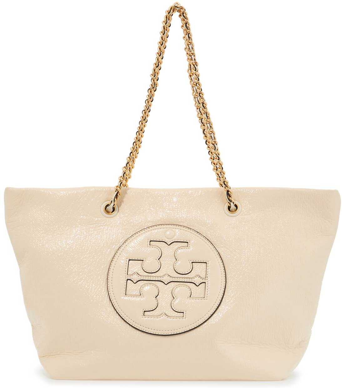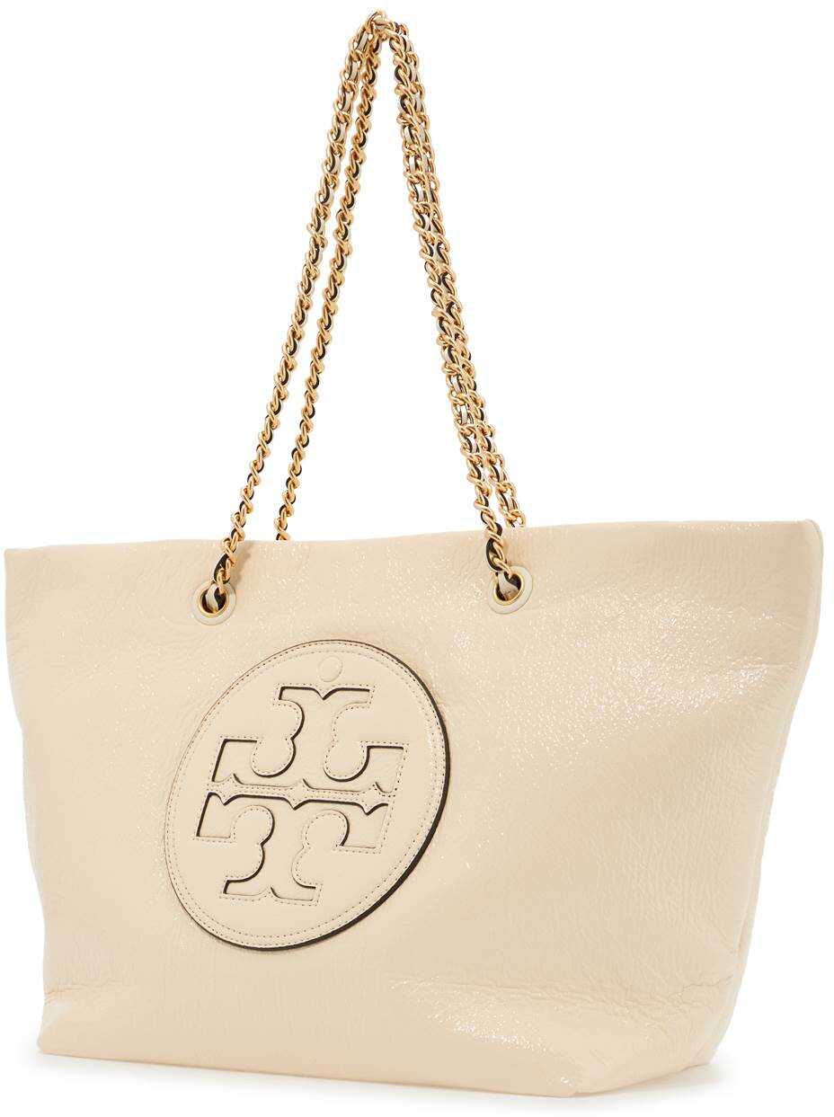 The Tory Burch Ella shopping bag is made of coated canvas with a textured, glossy finish. It features double chain handles with woven leather and a double T patch on the front that also serves as a pocket. The interior is lined with nylon and has a zippered pocket. All metal hardware has a gold finish.