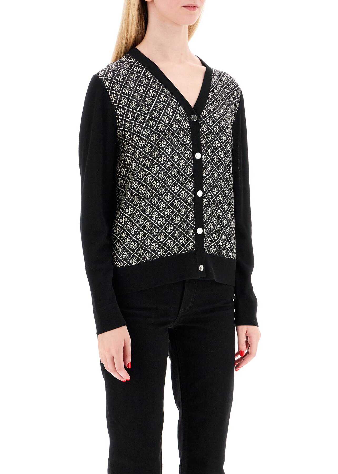 This Tory Burch cardigan is made of wool with a front insert in silk twill featuring the classic Double T motif. It has button closure, a V-neckline, and ribbed edges for a regular fit. The model is 177 cm tall and wears size S.