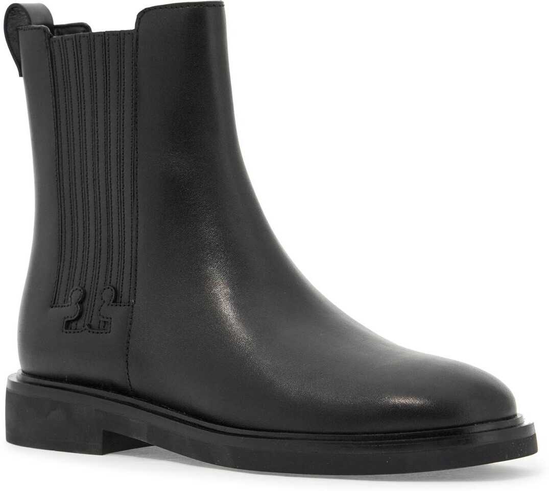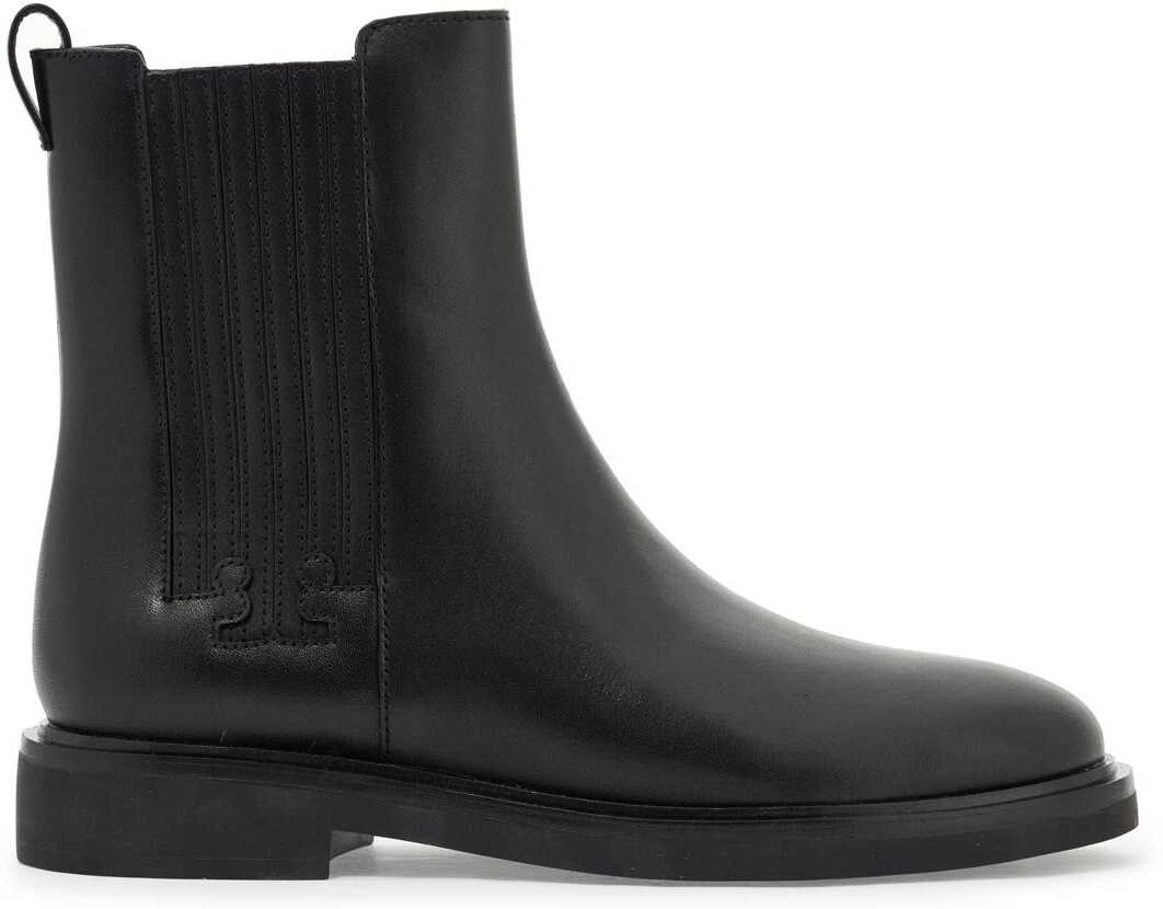 These Tory Burch Chelsea boots are made of leather with T-shaped finishes on the side elastics. They feature a back pull tab, leather interior, and rubber sole.