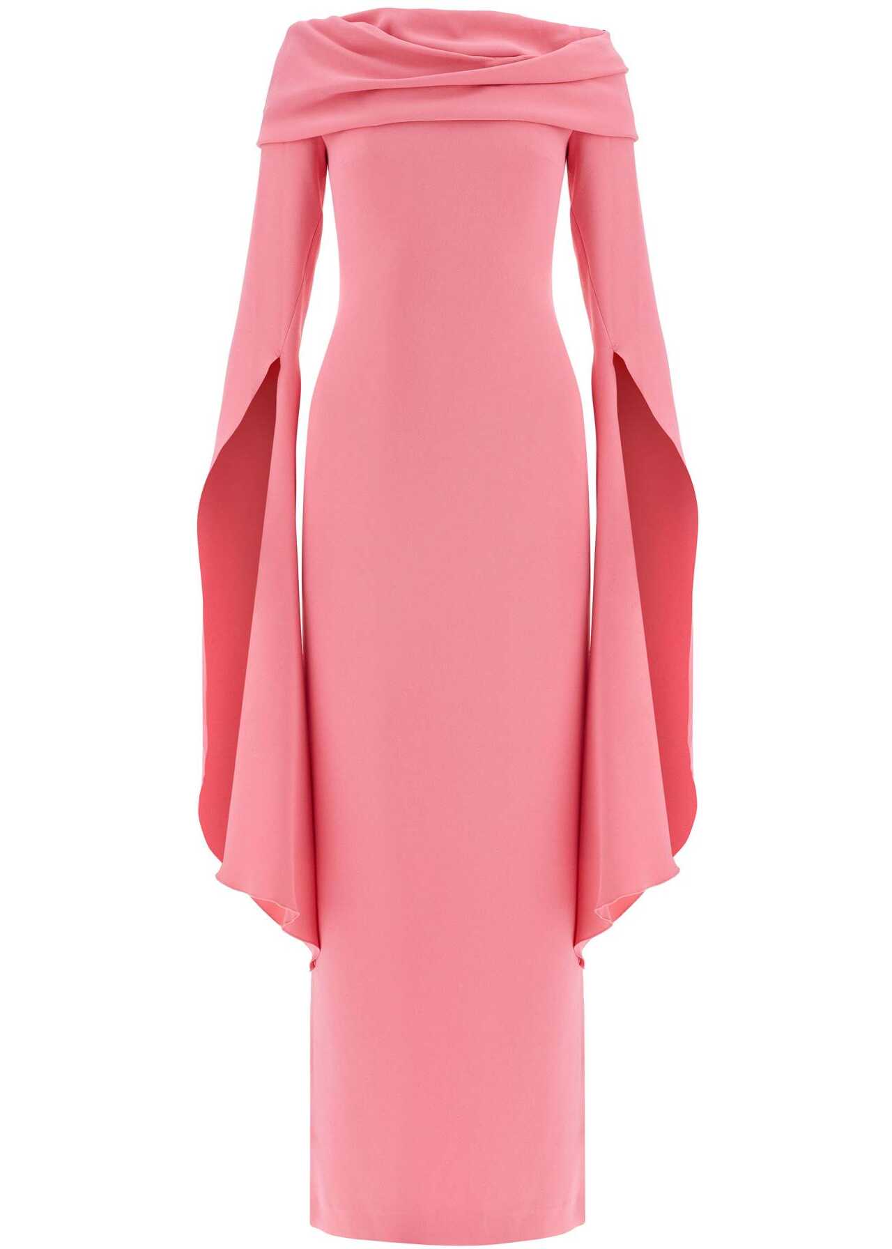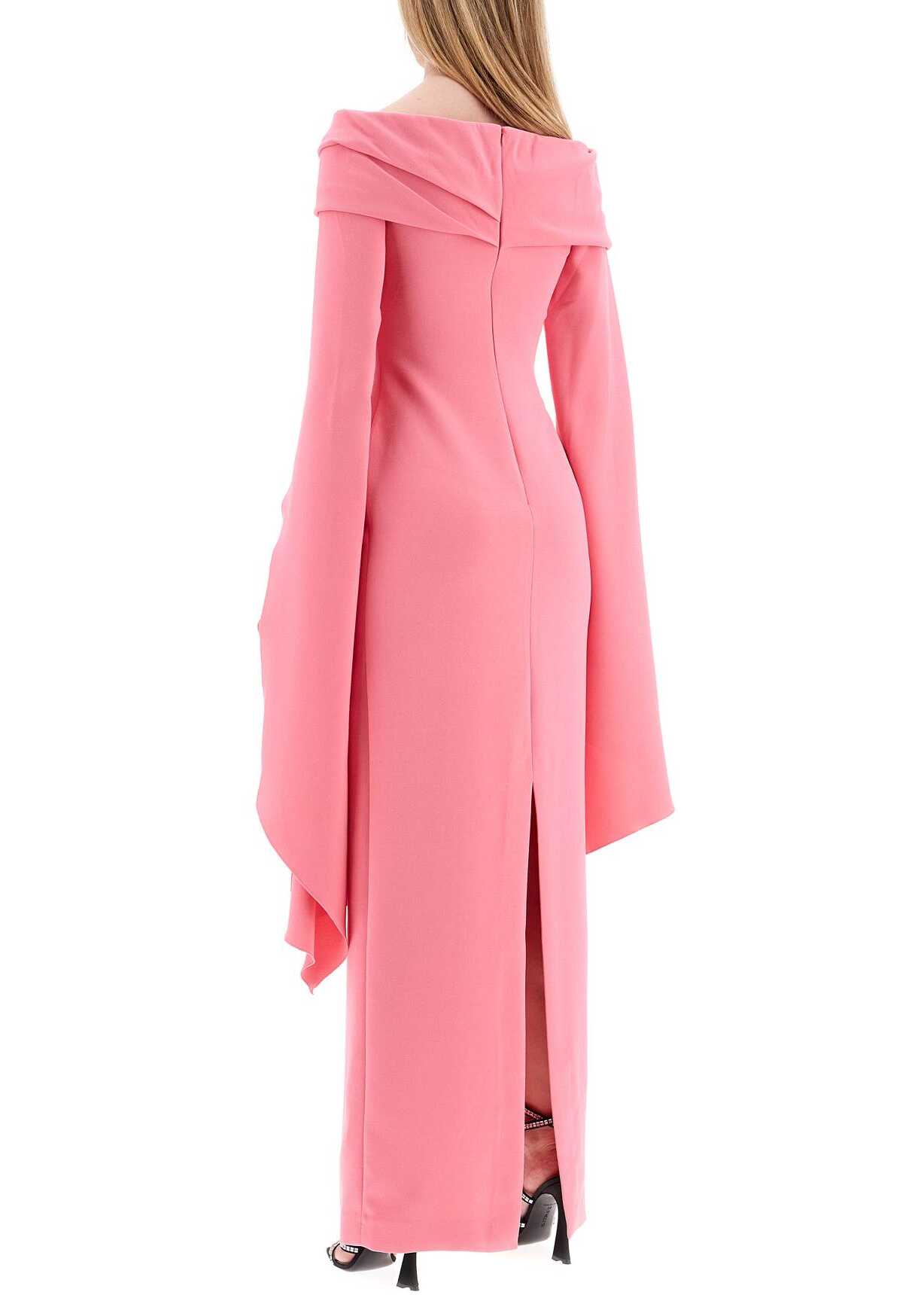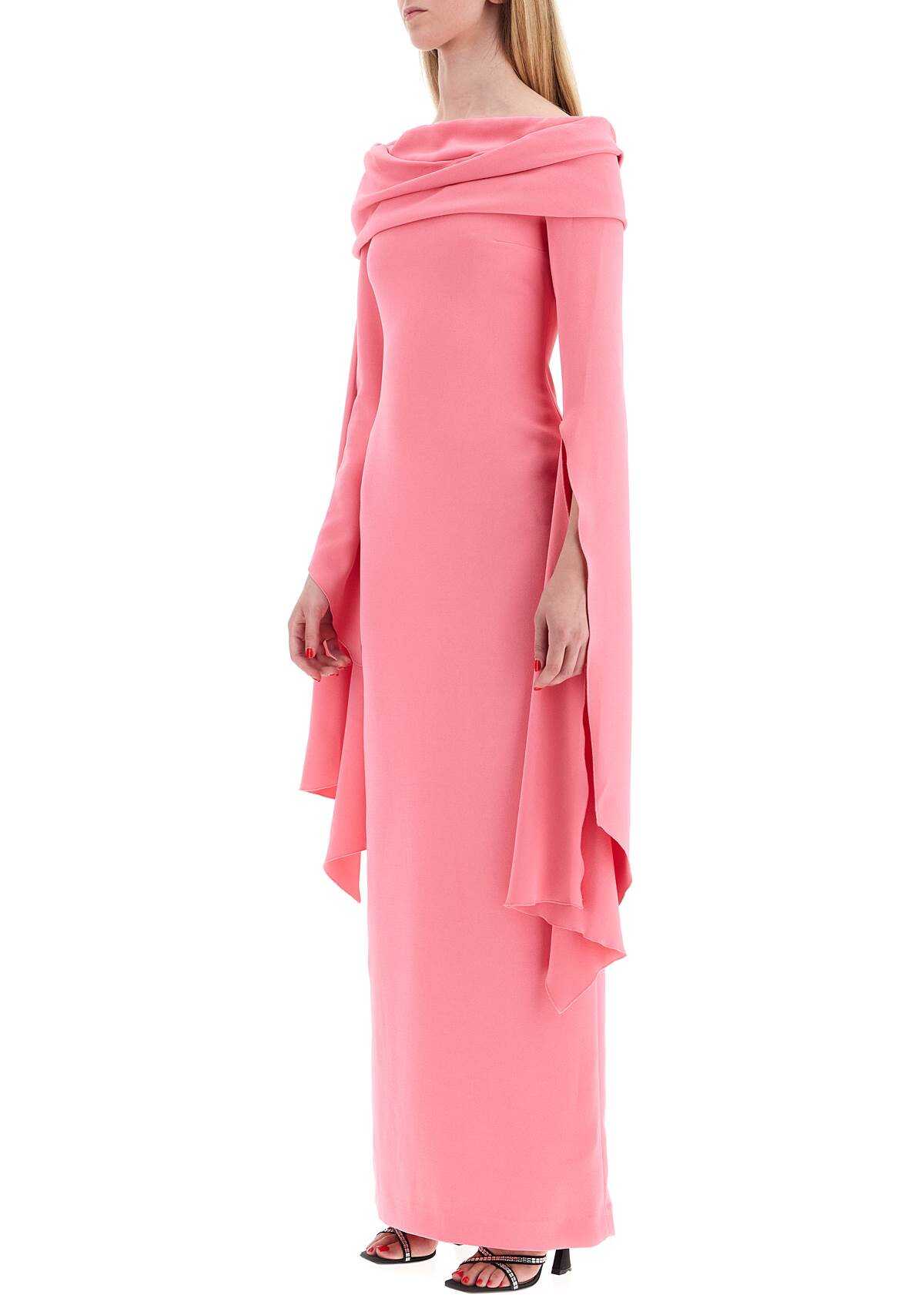 This Solace London long dress features a draped off-shoulder neckline and asymmetrical long sleeves. Made of opaque crêpe jersey, it has a fitted silhouette with a back slit. Invisible zip closure at the back. The model is 177 cm tall and wears a UK size 8.