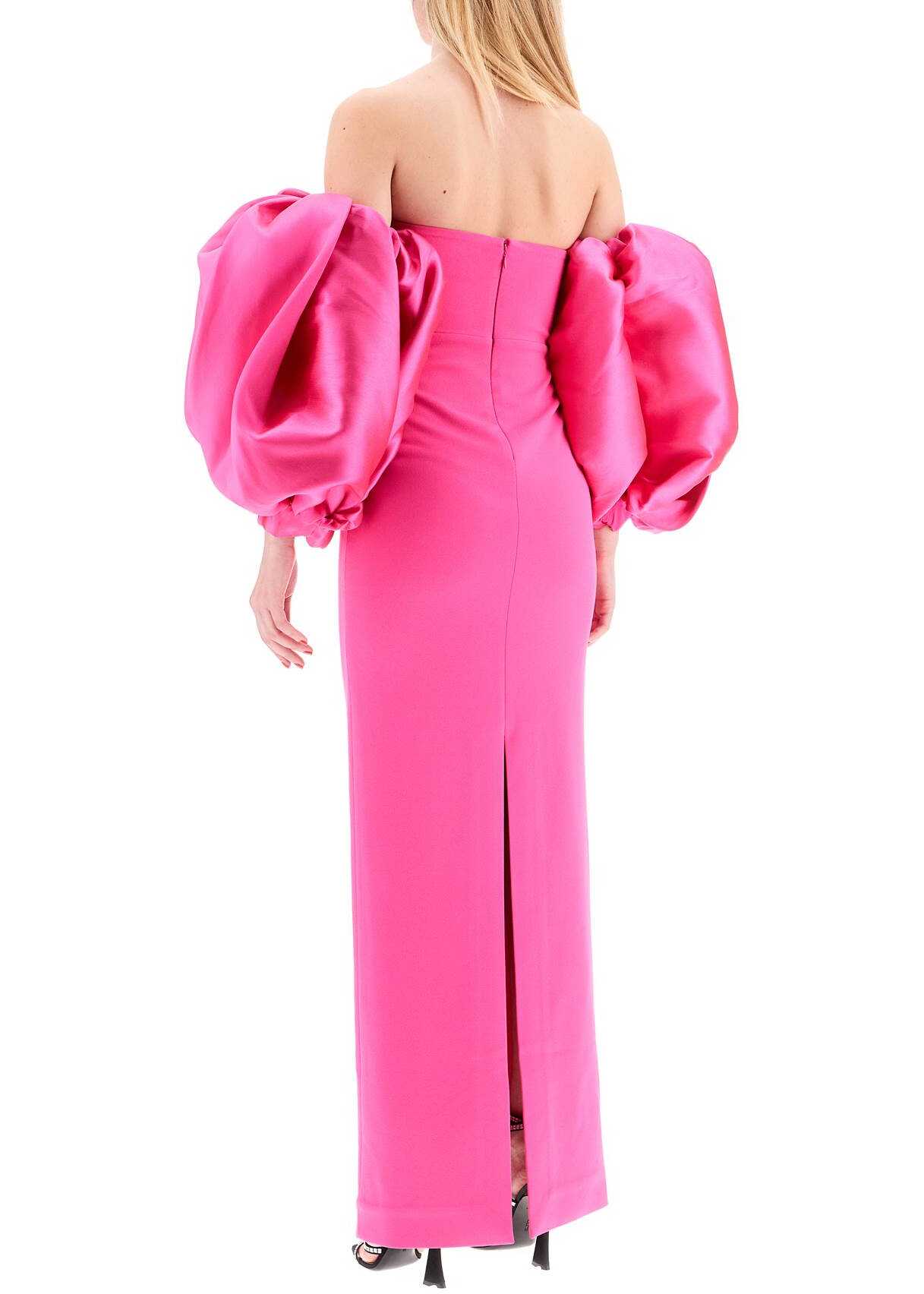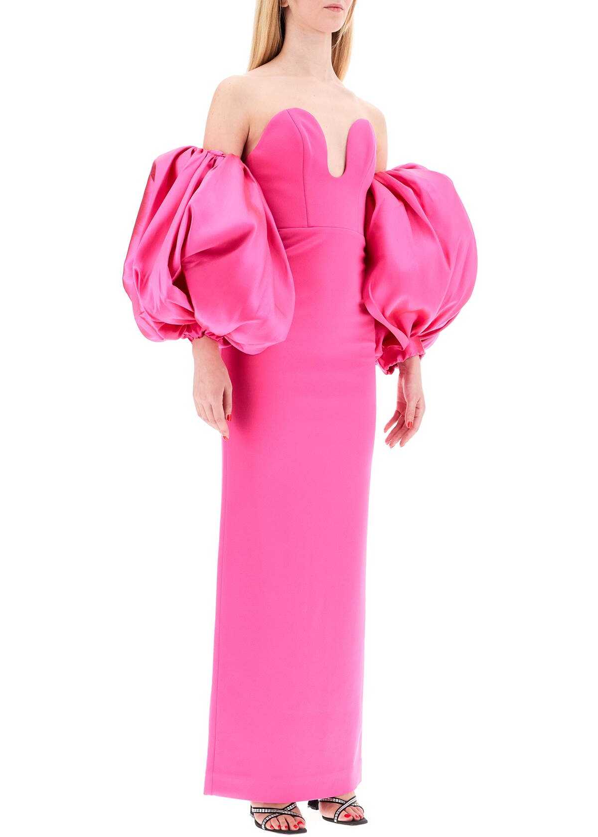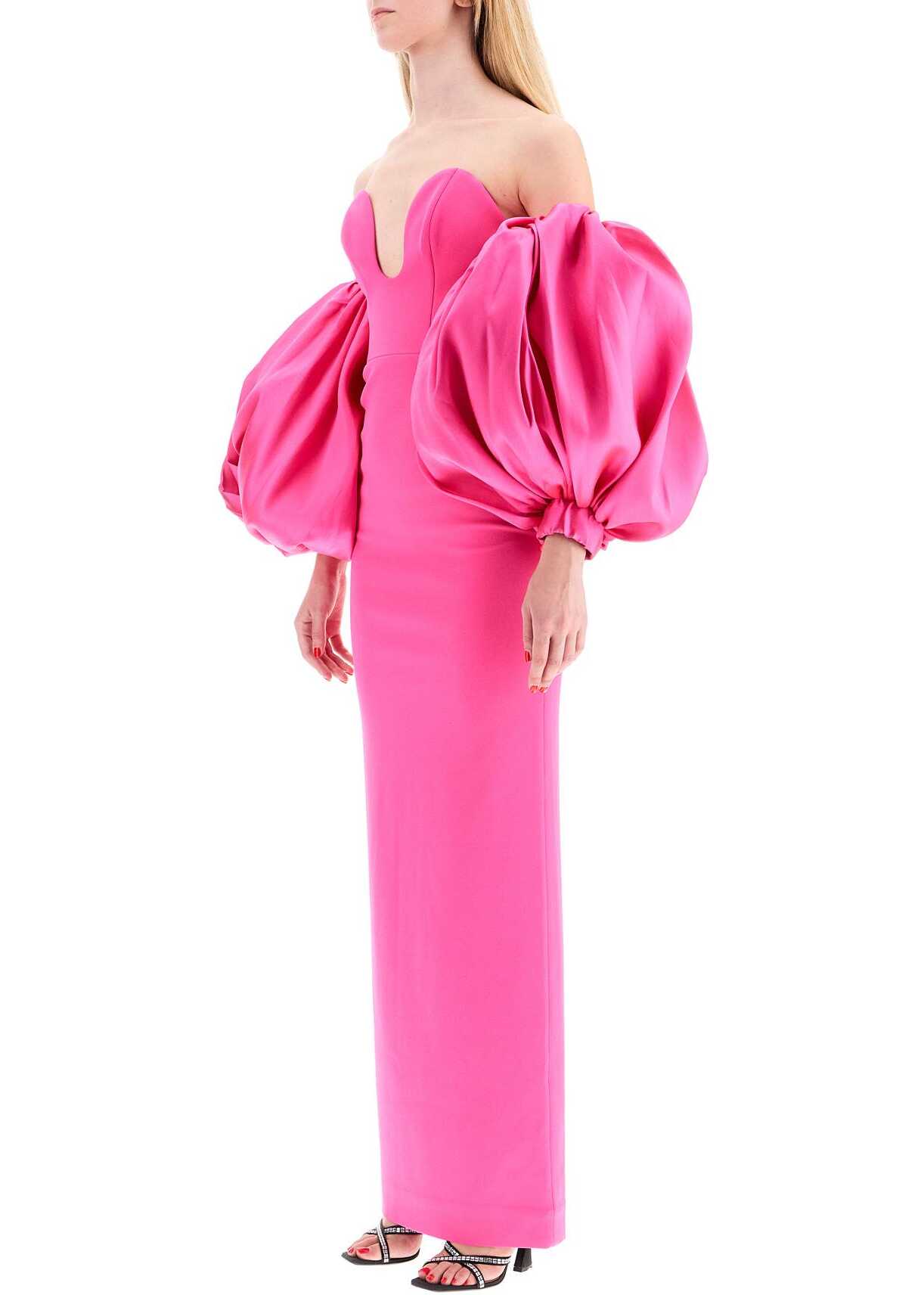This long Solace London dress is characterized by the bustier bodice framed by a deep graphic neckline and voluminous removable sleeves in shiny mikado. Made of opaque crêpe jersey, it has a fitted column silhouette with a back slit. Invisible zip on the back. The model is 177 cm tall and wears a UK size 8.