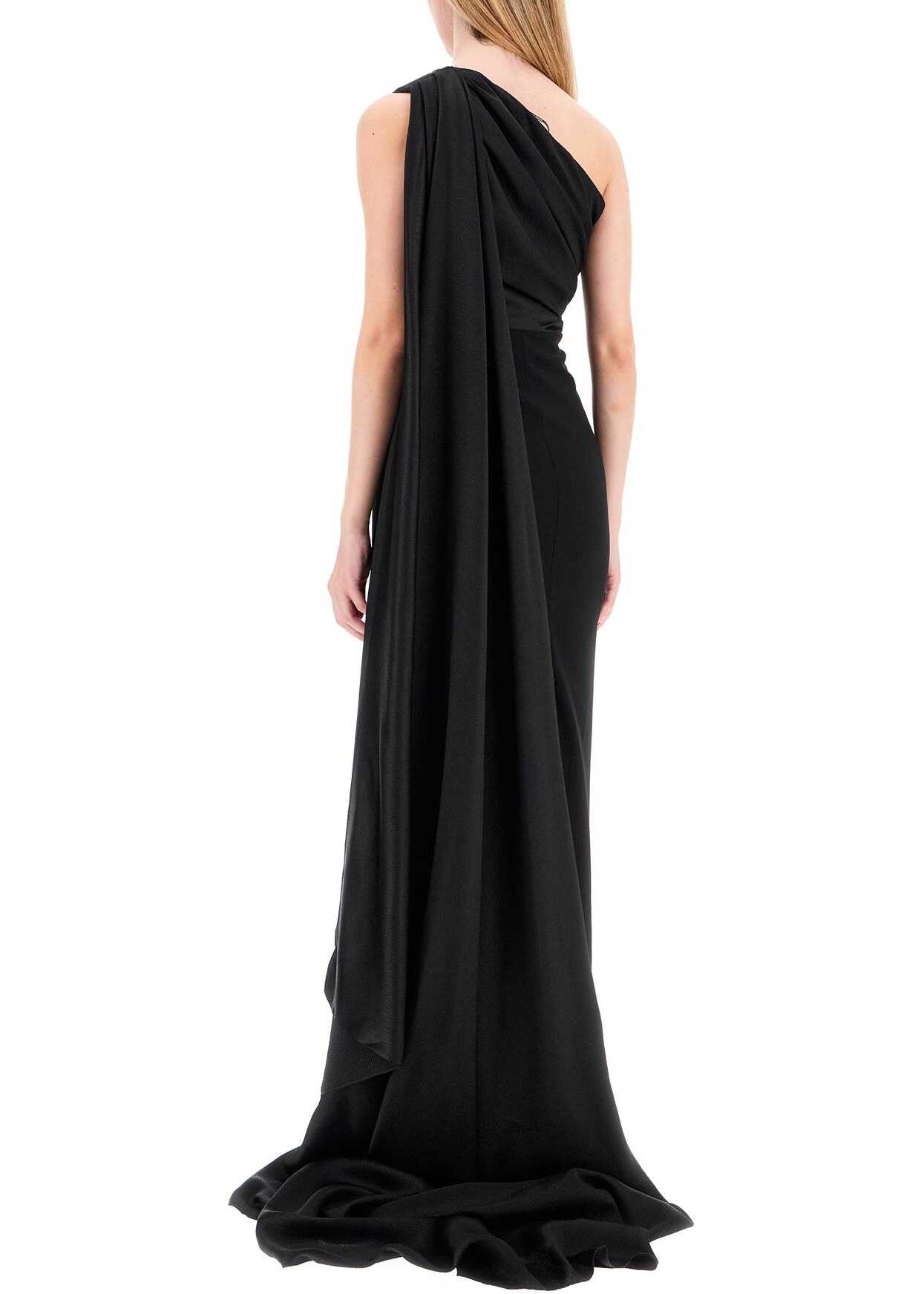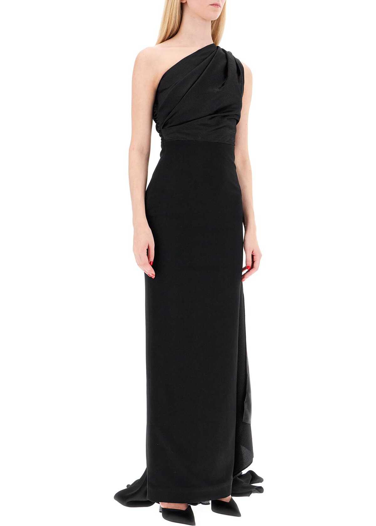 This long Solace London dress features a one-shoulder design with a draped bodice in shiny seersucker fabric, enriched by a long panel that cascades down the back. The straight and fitted skirt is made of double crepe jersey with a back slit. Invisible zip on the side. The model is 177 cm tall and wears a UK size 8.