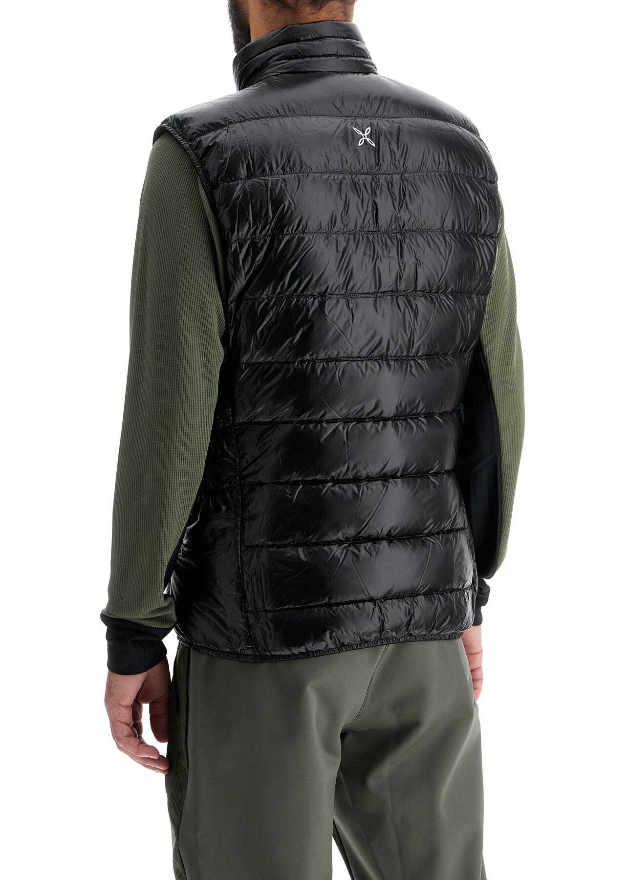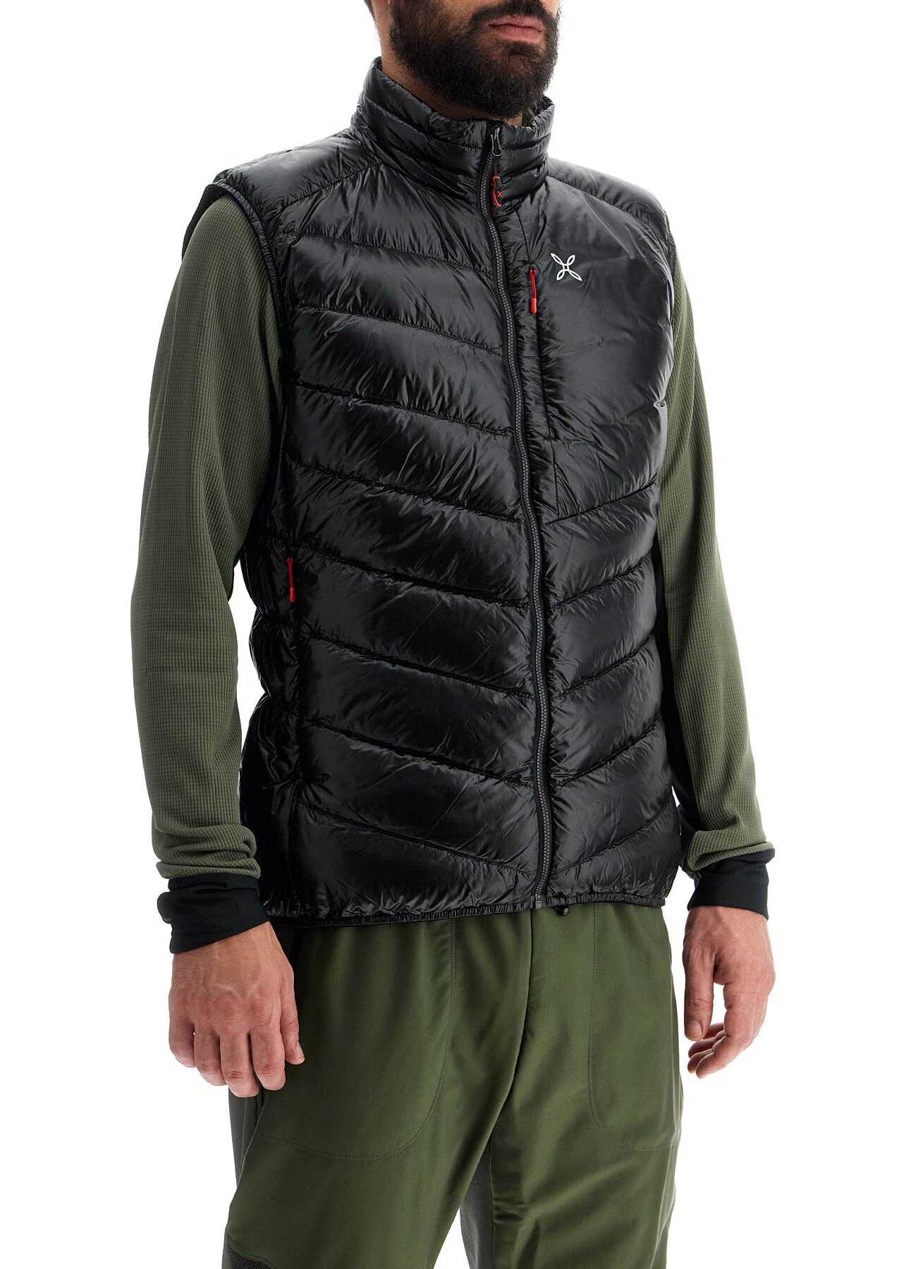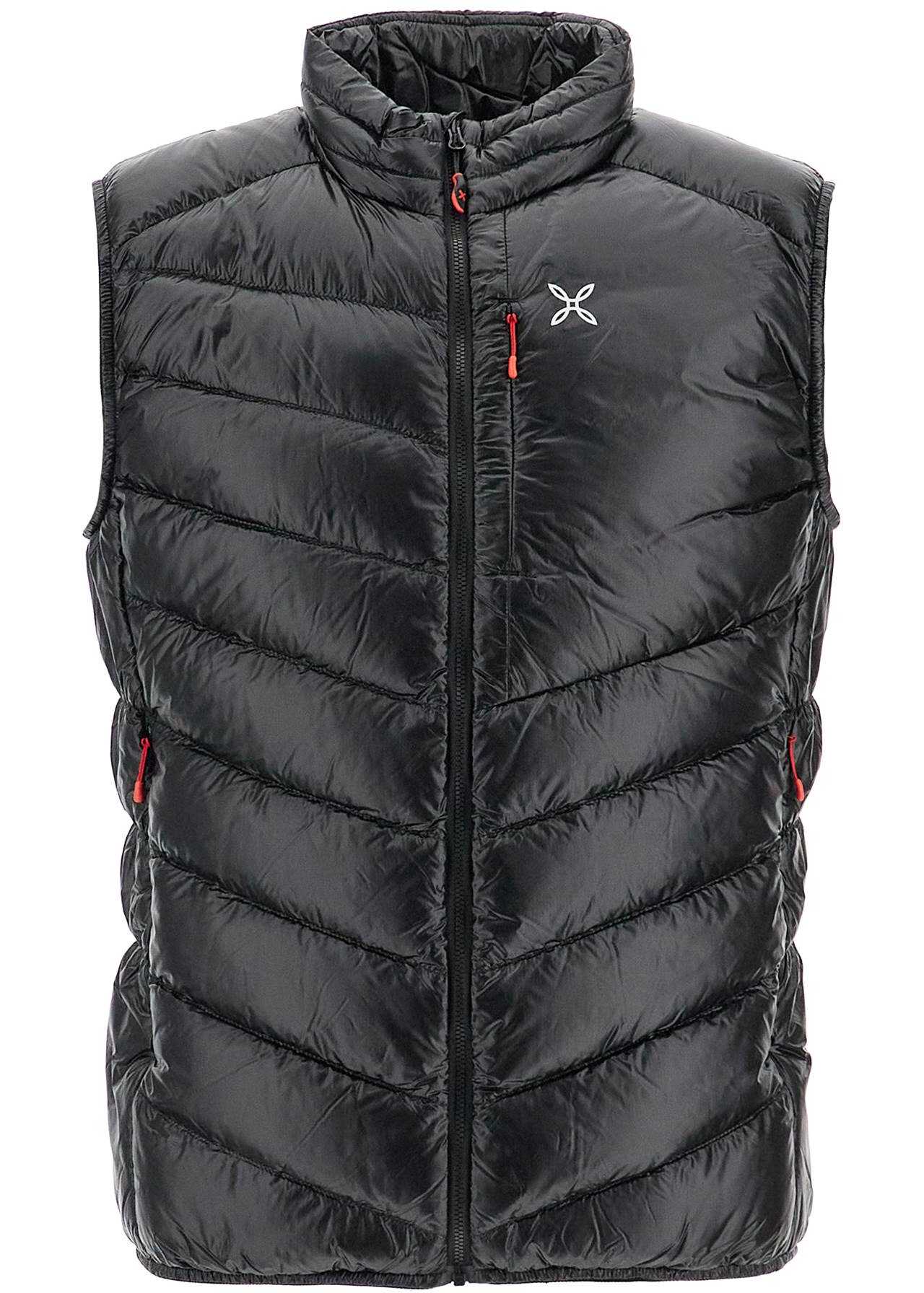 The Montura sleeveless down jacket is made of quilted micro ripstop nylon, with a DWR water-repellent treatment and warm 90/10 duck down and feather filling. Featuring a regular fit, it has a standing collar, front zip closure, and invisible zip pockets. Reflective logo details complete the design. The model is 182 cm tall and wears a size M.