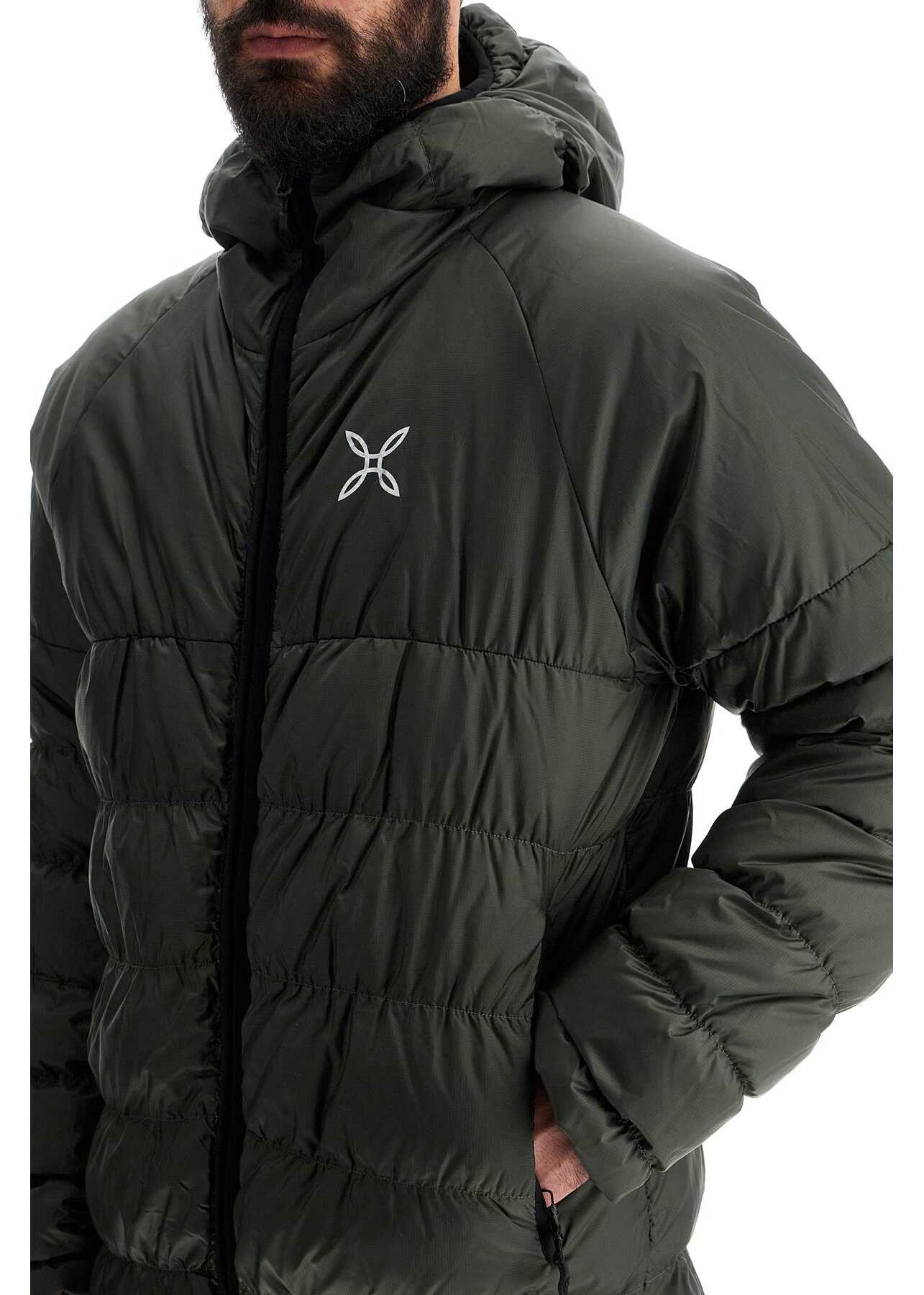 Montura Down Jacket made of quilted micro ripstop Pertex Quantum, with water-repellent and windproof properties. Internally padded with 90/10 duck down and feathers, and signed with reflective logo lettering on the back. Features a fixed hood, zip closure and pockets, and contrast elastic edges. Can be folded into its own internal pocket. The model is 187 cm tall and wears a size L.