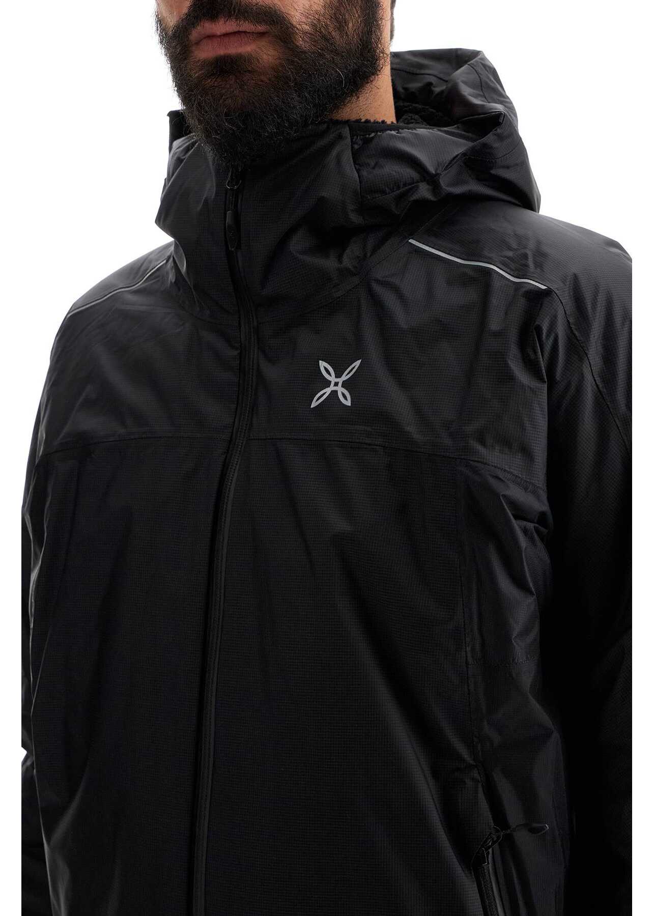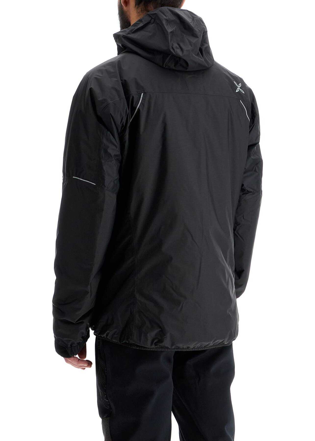 The Montura trekking jacket is made of durable Pro-Meteo ripstop nylon, with a DWR water-repellent treatment. It features a soft fleece-lined hood and back panel. The lightweight Primaloft padding provides extra warmth. The jacket also has a zip closure, side pockets, adjustable cuffs with velcro straps, an elasticized hem, and an internal pocket. Reflective details complete the design. The model is 187 cm tall and wears a size L.